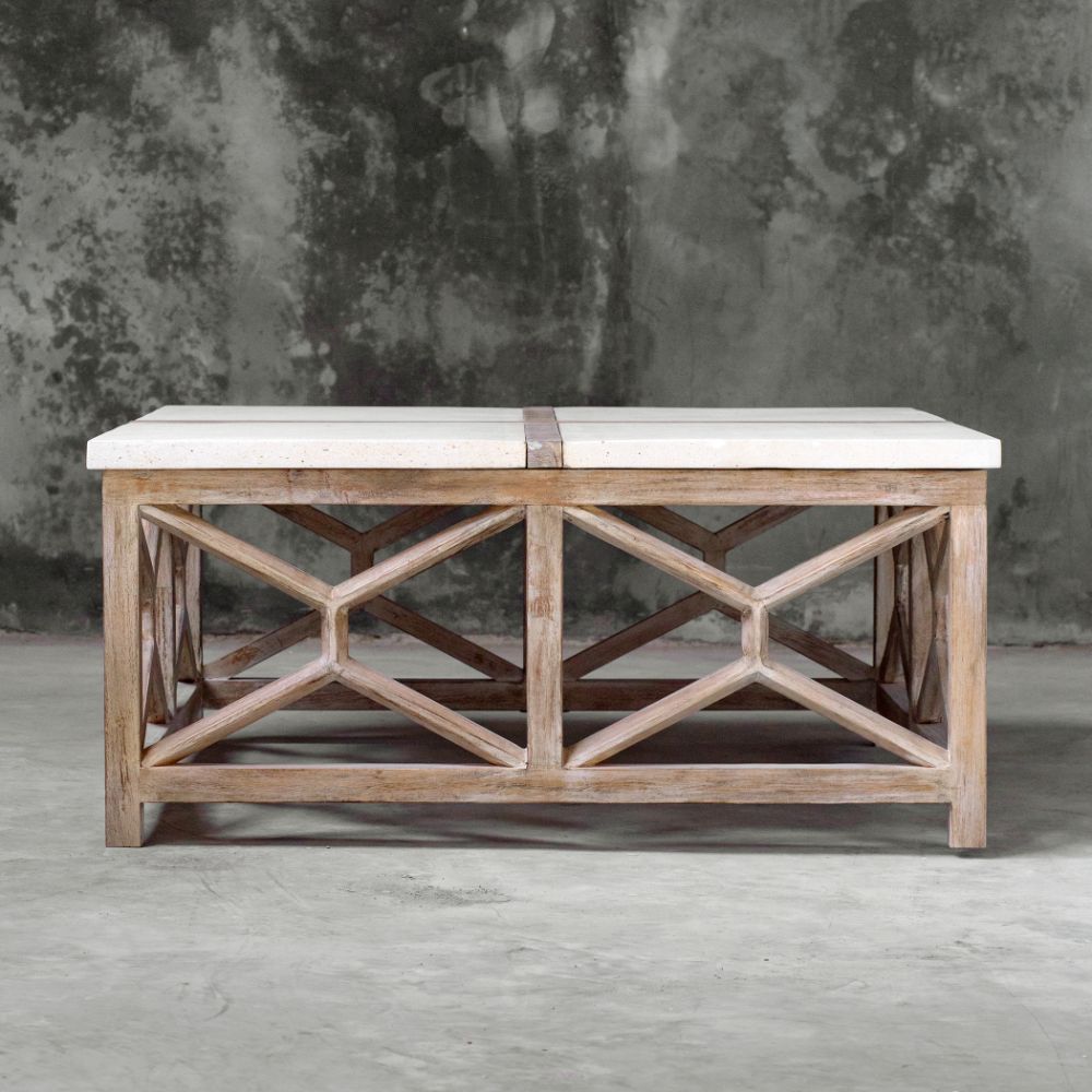 Handcrafted From Solid Mixed Woods with An Natural Ivory Limestone Top, on A Geometric Base Finished in A Warm Oatmeal Wash. True to The Characteristics of Natural Stone, Each Piece Will Have Unique Coloration and Veining. Solid Wood Will Continue to Move with Temperature and Humidity Changes, Which Can Result in Cracks and Uneven Surfaces, Adding to Its Authenticity and Character.