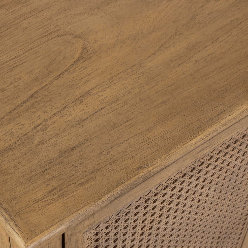 Mid Century Inspired With Accents Of Natural Rattan Cane, This Two Door Cabinet Features Mindi Solids And Veneers Finished In A Soft Oak Stain. The Two Doors Have Metal Hardware Finished In Dark Gunmetal.