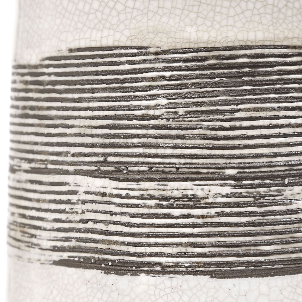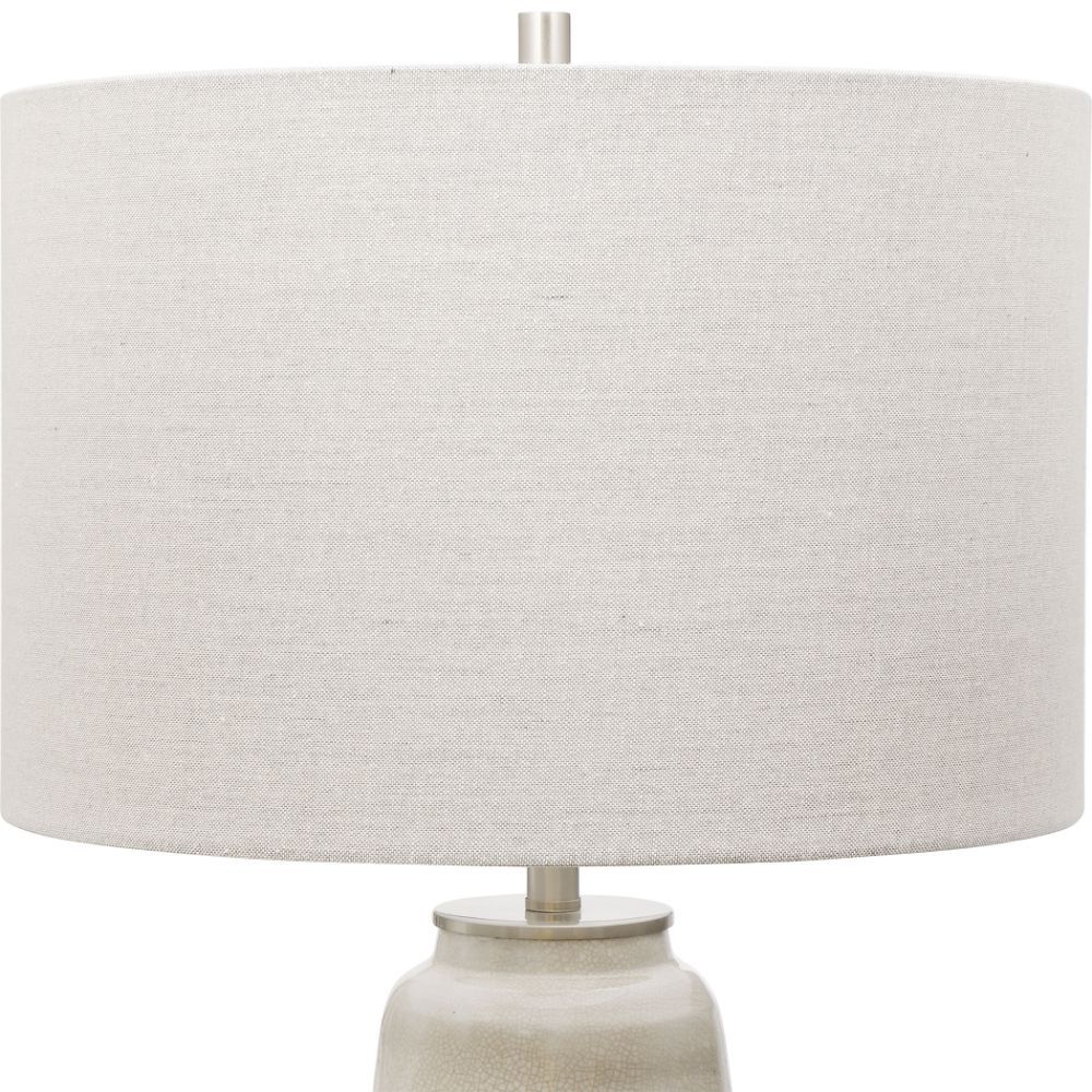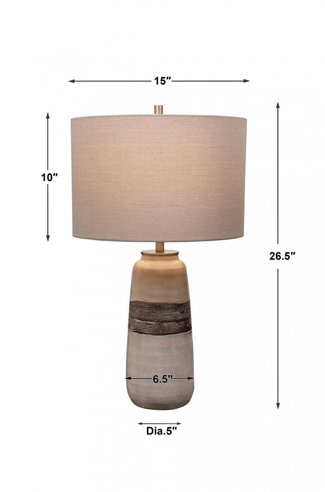 Showcasing A Rustic Casual Look, This Ceramic Table Lamp Features An Off-white Crackle Glaze with Distressed Rust Brown Details and Noticeable Ribbed Texture, Paired with Plated Brushed Nickel Accents. A Light Gray Linen Fabric Drum Shade Complements The Piece.
