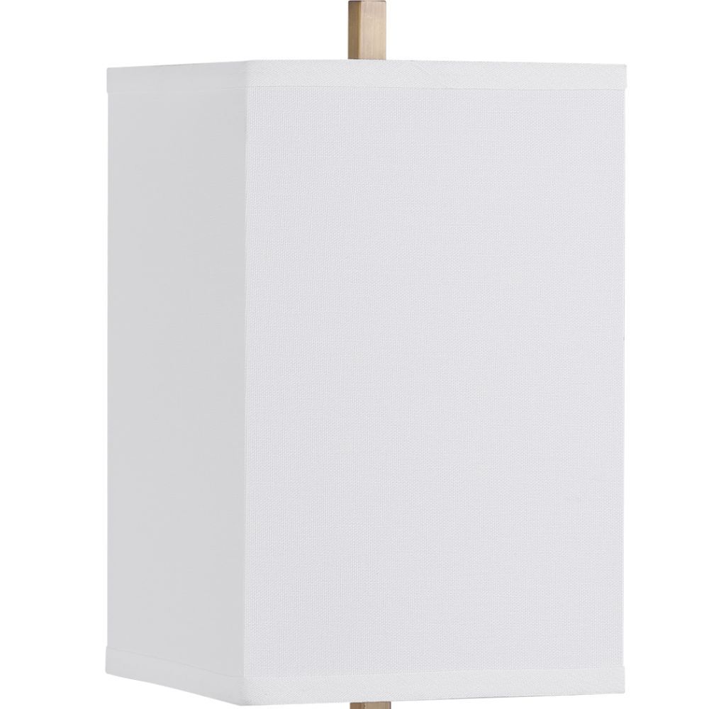 Speckled Mercury Glass Accented with Coffee Bronze Plated Details and A Crystal Foot. The Square Hardback Shade is An Off-white Linen Fabric.