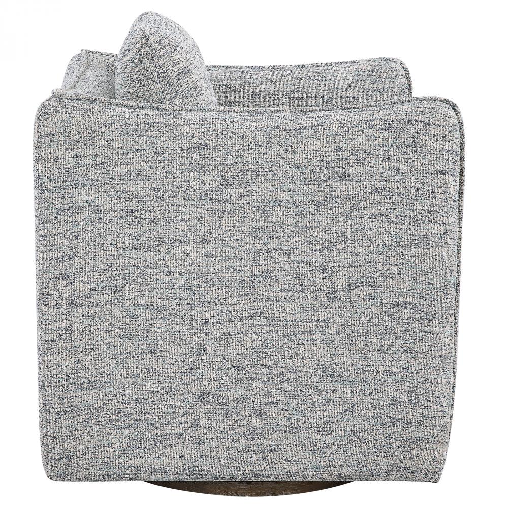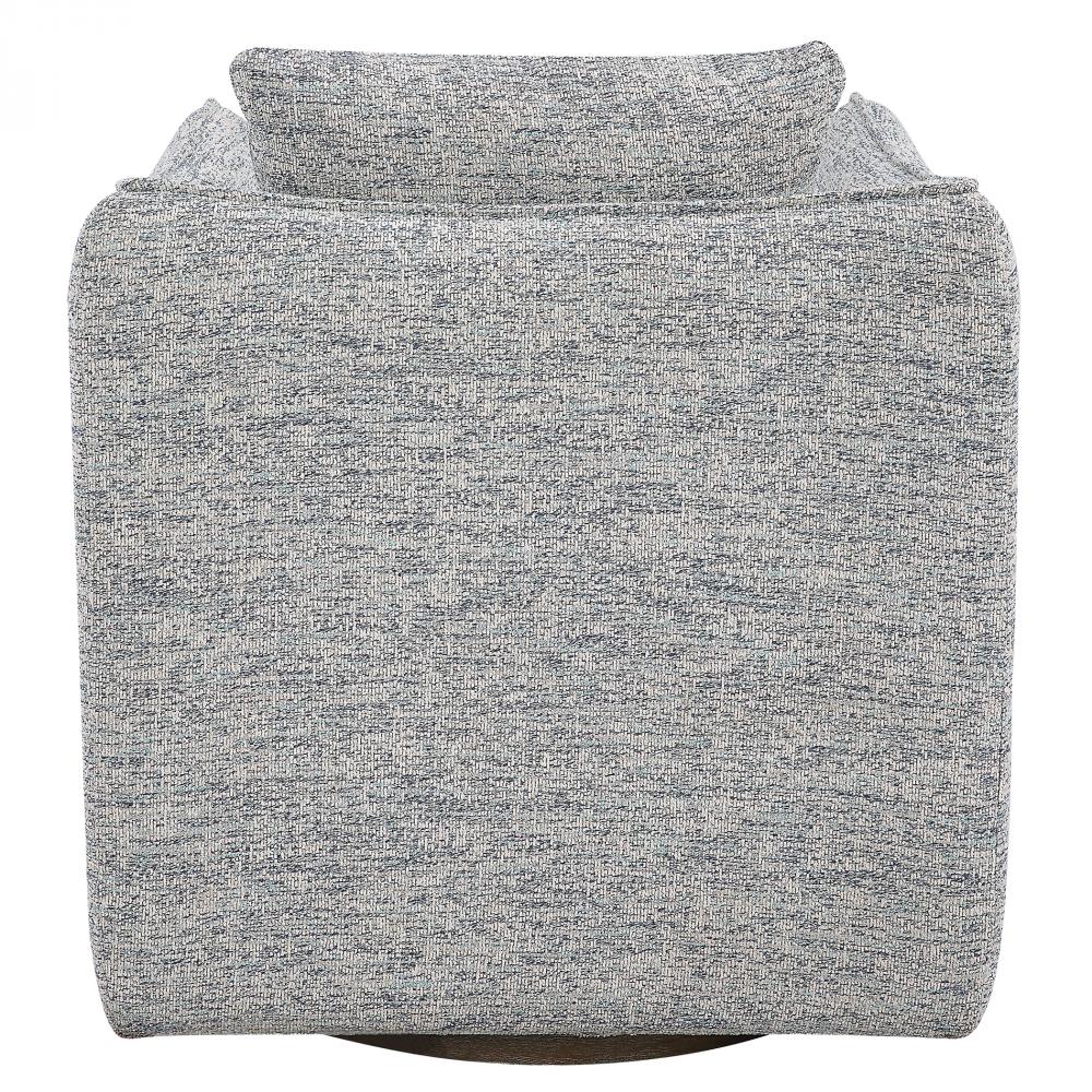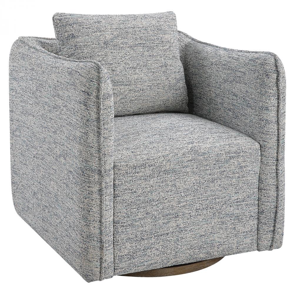 Casual Shelter Arm Accent Chair Tailored in A Casual Blue and White Tweed Fabric. Features A Flanged Edge Trim Complete with A Loose Back Pillow. Rests on A Solid Birch Wood Swivel Base, Finished in A Weathered Gray Stain. Seat Height is 19".