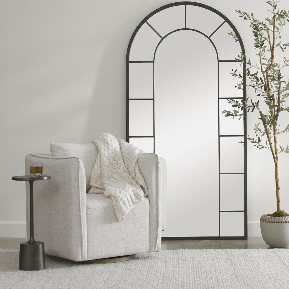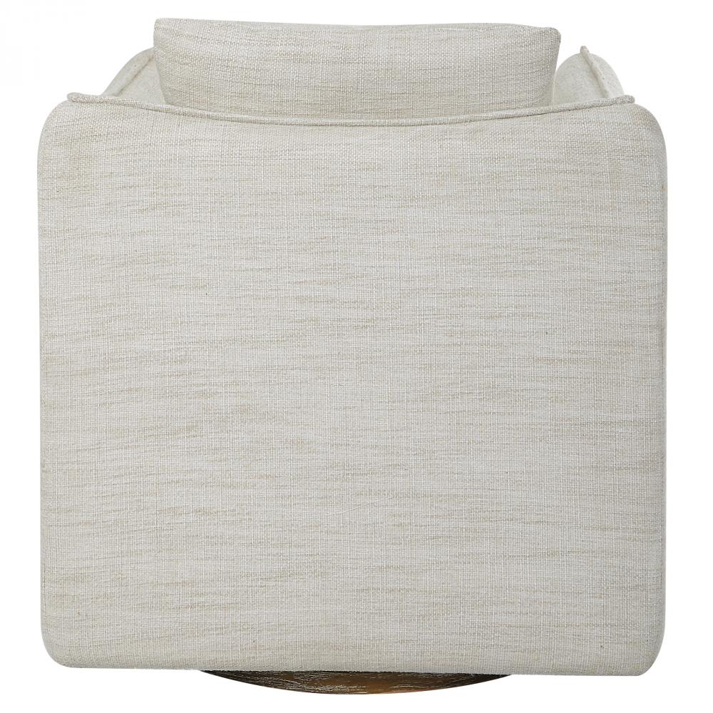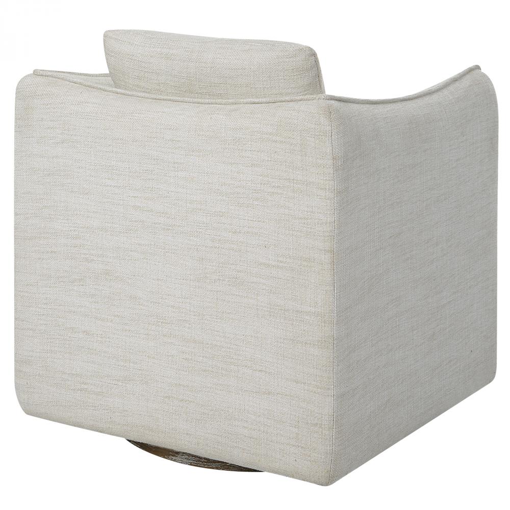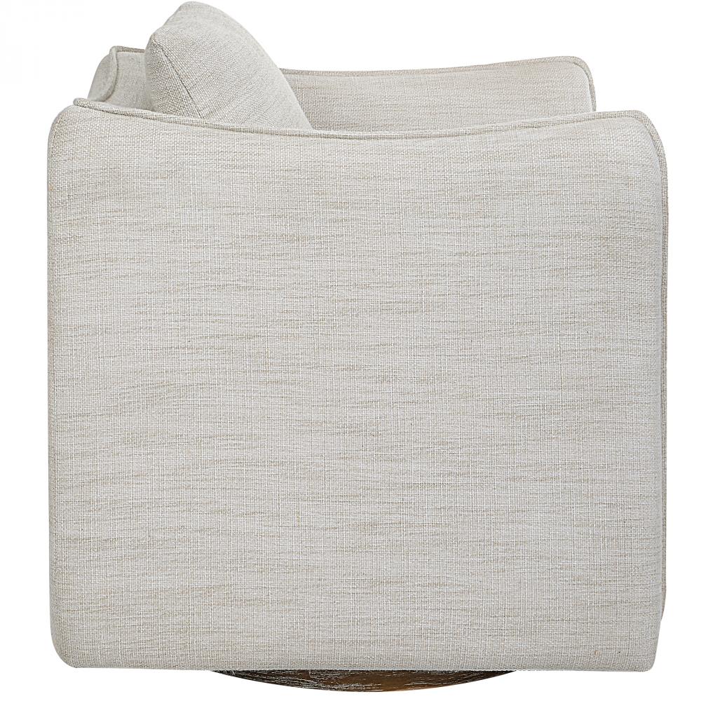 Casual Shelter Arm Accent Chair Tailored in A Woven Linen Blend Fabric in Off-white, Featuring A Flanged Edge Trim Complete with A Loose Back Pillow. Rests on A Solid Birch Wood Swivel Base, Finished in A Weathered Gray Stain. Seat Height is 19"