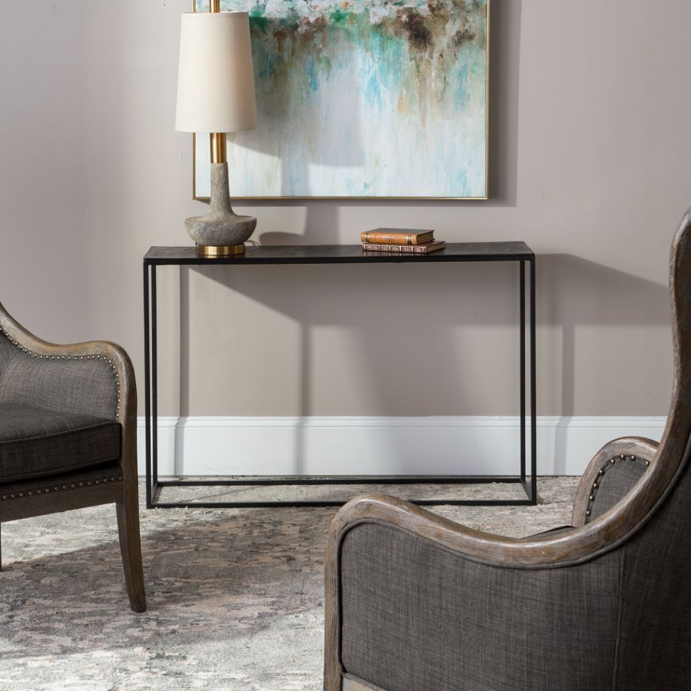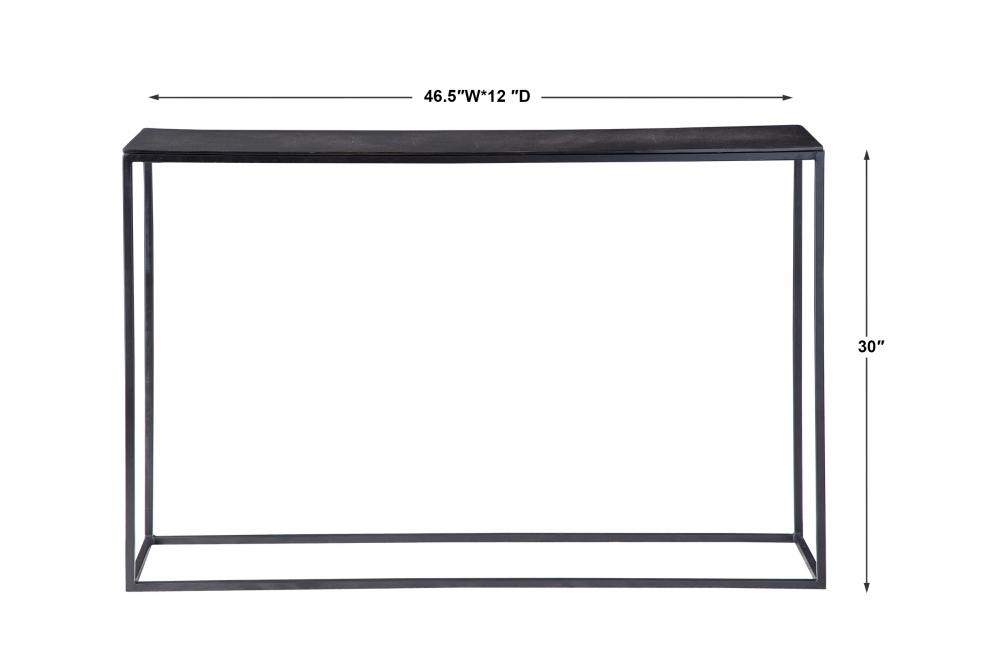 Simplistic Industrial Style Console Table, Constructed in An Aged Black Iron Featuring A Cast Textured Aluminum Slab Top Finished in A Plated Antique Bronze.