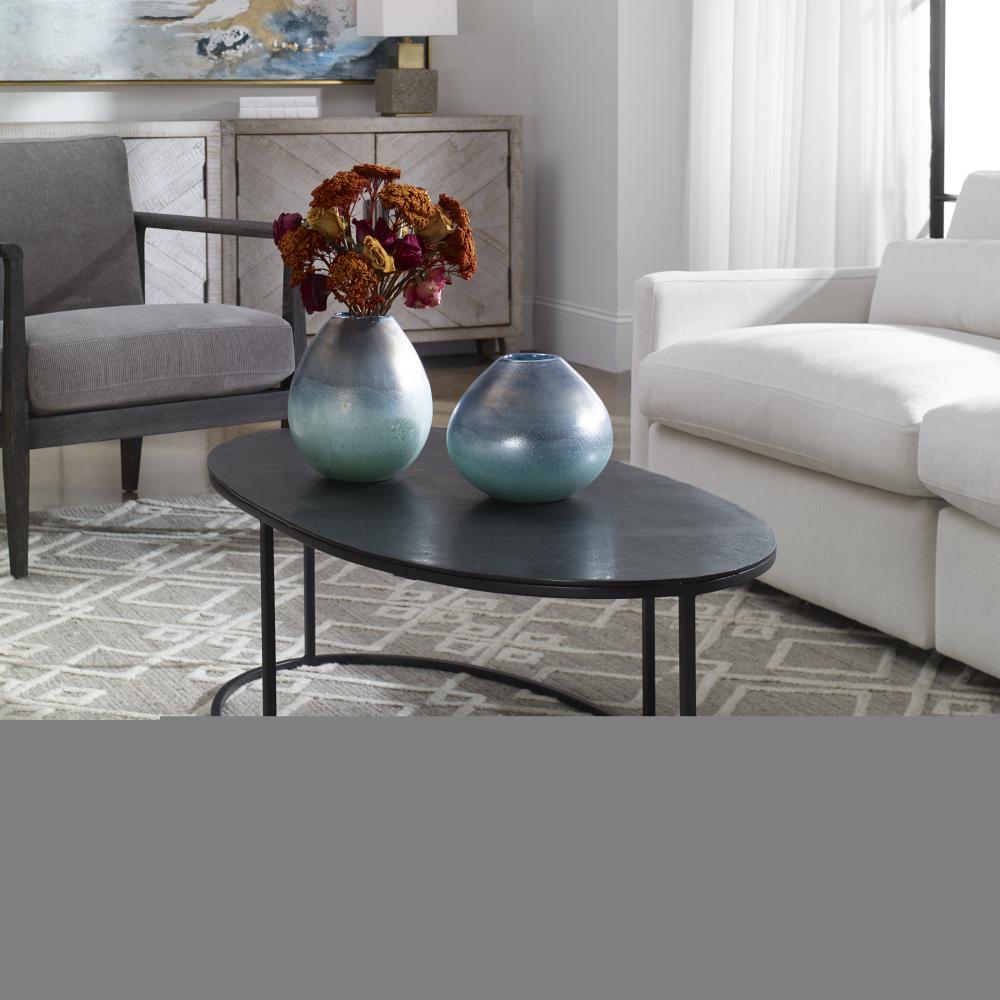Simplistic Industrial Style Coffee Table, Constructed in An Aged Black Iron Featuring A Cast Textured Aluminum Slab Top Finished in A Plated Antique Black.
