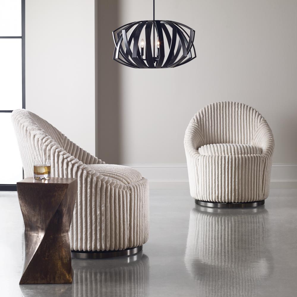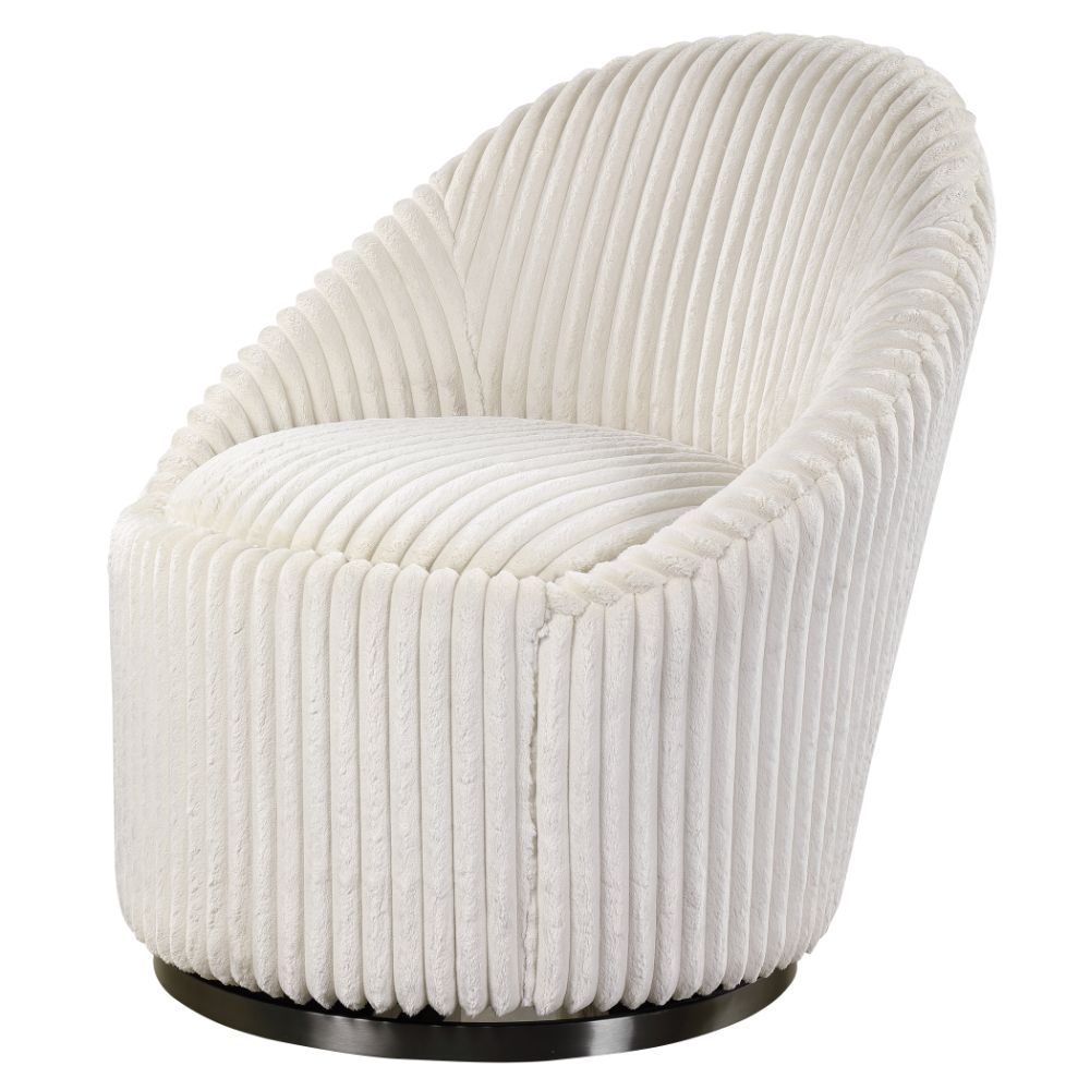 A Blend of Contemporary and Feminine Styles, This Chair is Upholstered in A Luxurious Fluted Ivory Chenille Fabric and is Accented By A Stainless Steel Swivel Base Finished in Brushed Black Nickel. Seat Height is 19".