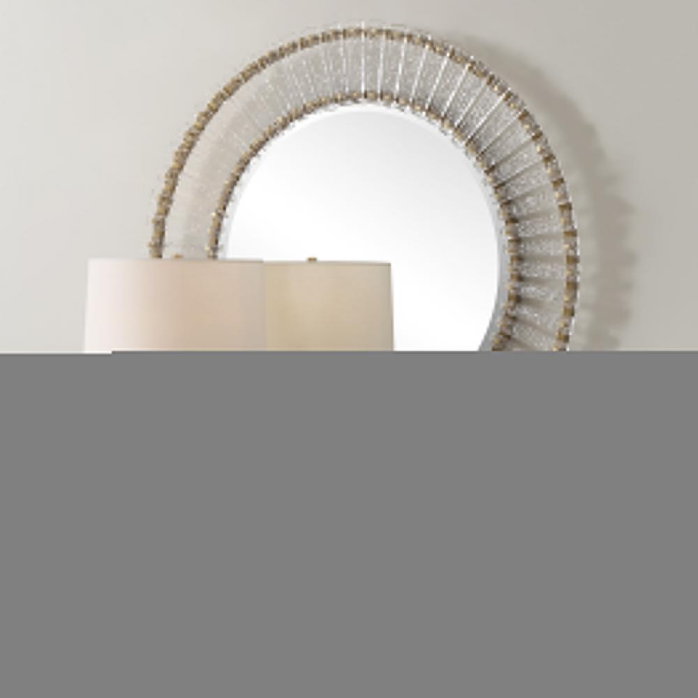 The Denali Round Mirror Features Textured Glass Keys Suspended Around Brushed Gold Iron Frames. Mirror Has A Generous 1" Bevel.