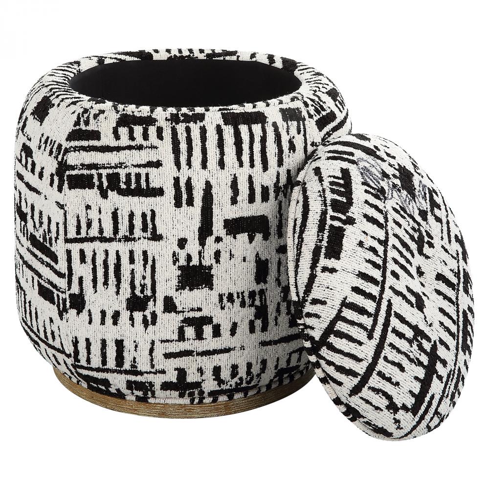 A Statement Abstract Also Acting As A Neutral, The Dialogue Accent Stool Features A Black and Off White Pattern Over An Oak Finished Solid Wood Base with Beige Ceruse. Top is Removable for Extra Storage.
