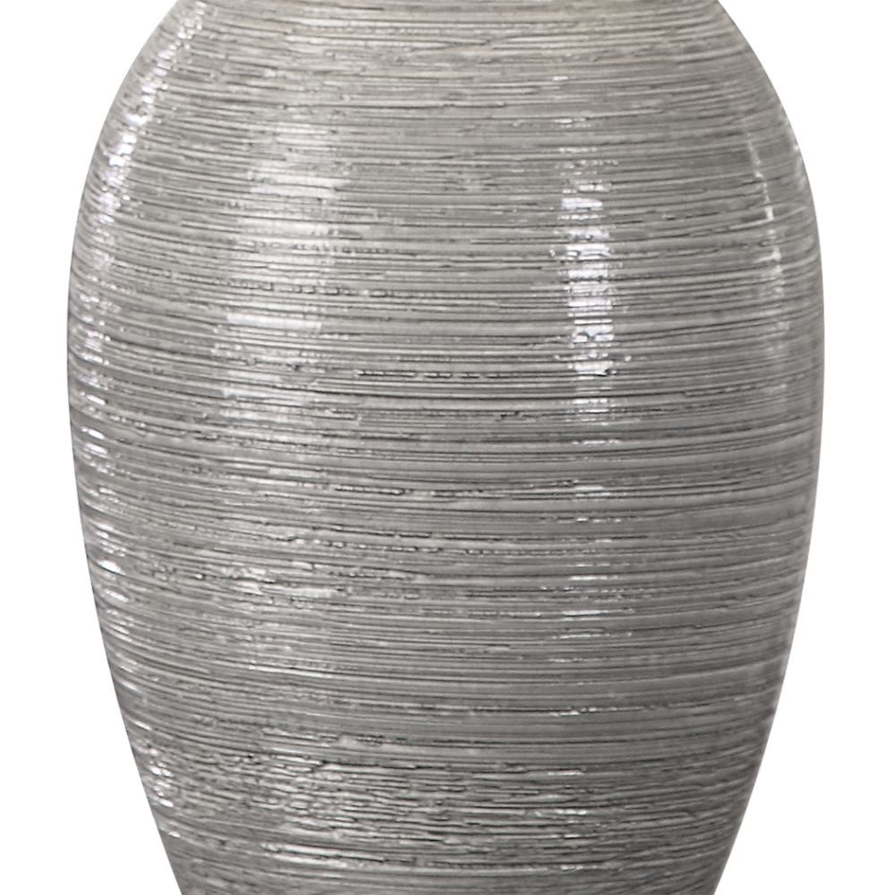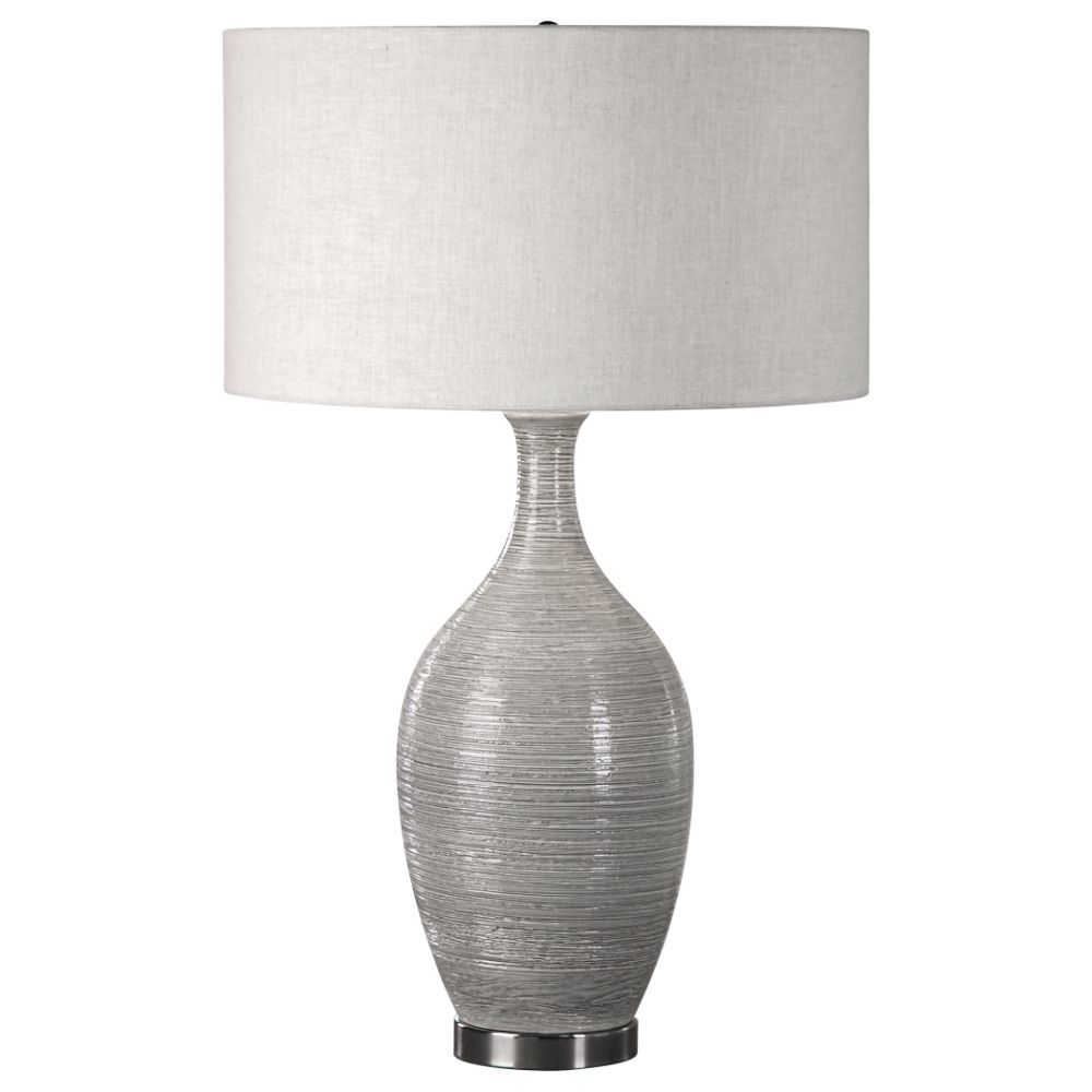 This Ceramic Base Features A Coarse, Horizontal Texture, Finished in A Mushroom Gray Glaze, Accented with Plated Polished Nickel Details. The Round Hardback Drum Shade is A Light Beige Linen Fabric with Natural Slubbing. Due to The Nature of Fired Glazes on Ceramic Lamps, Finishes Will Vary Slightly.