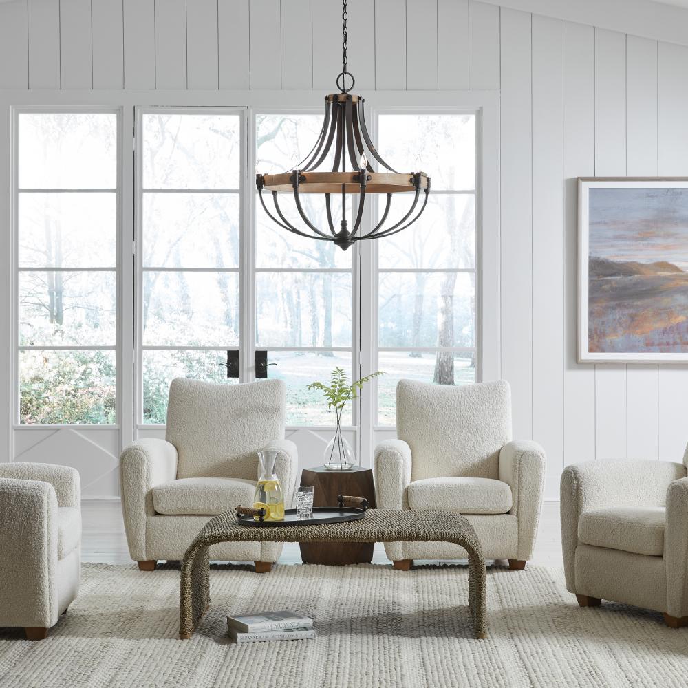 Updated Empire Shaped 8 Lt. Chandelier with A French Influence, Featuring A Ring of Natural Oak A Bronze Metal Frame. 8-60 Watt Max, Candelabra Sockets. Bulbs Not Included. Supplied with 20' Wire and 7' Chain for Adjustable Installation.