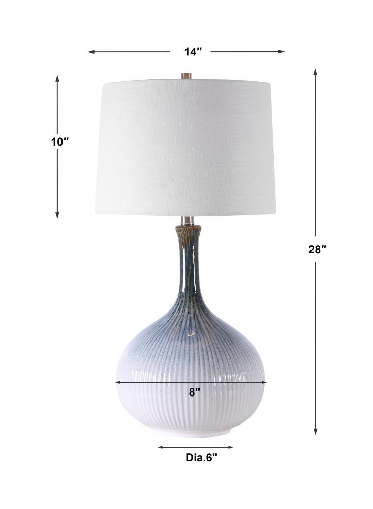 Mid-century Inspired Table Lamp Has A Fluted Ceramic Base with Noticeable Ribbed Texture and is Finished in A Cream, Light Blue, Indigo, and Dark Brown Ombre Glaze with Brushed Nickel Plated Accents. The Lamp is Paired with A Tapered Round Hardback Shade in An Off-white Linen Fabric with Light Slubbing.