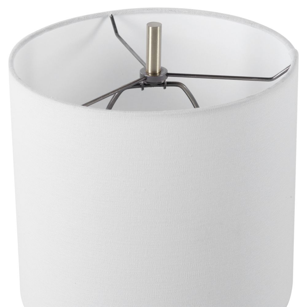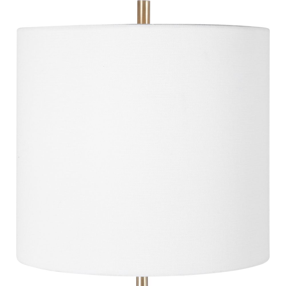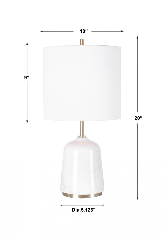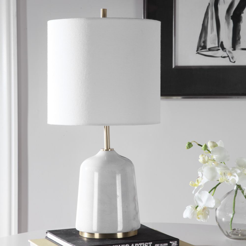 This Elegant Table Lamp Showcases A Thick White Marble Base with With Subtle Gray Veining, Accented with Brushed Light Brass Plated Details. The Lamp is Paired with A White Linen Fabric, Round Drum Shade.