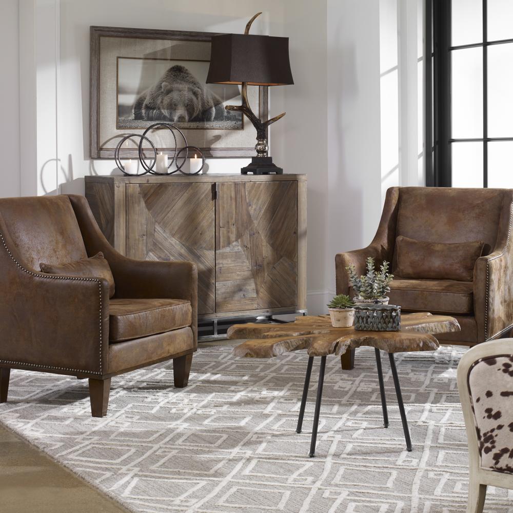 Featuring Abstract Geometric Marquetry Doors in Reclaimed Fir Wood, Sun Faded and Washed in A Walnut Stain, Atop A Forged Iron Base Finished in Aged Gunmetal. Solid Wood Will Continue to Move with Temperature and Humidity Changes, Which Can Result in Cracks and Uneven Surfaces, Adding to Its Authenticity and Character.