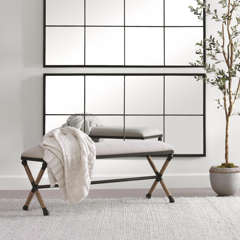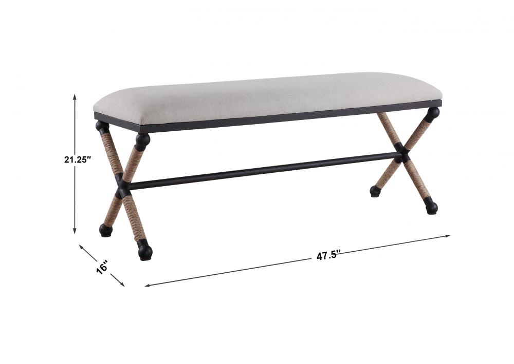 Rustic Iron Frame with A Nautical Touch, Wrapped in Natural Fiber Rope Accents. Cushioned Top is A Sturdy, Cotton in A Neutral Oatmeal.