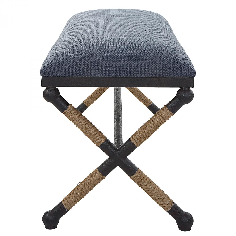 Rustic Iron Frame with A Nautical Touch, Wrapped in Natural Fiber Rope Accents. Cushioned Top is A Cotton Blend in A Rich Textured Navy Blue.