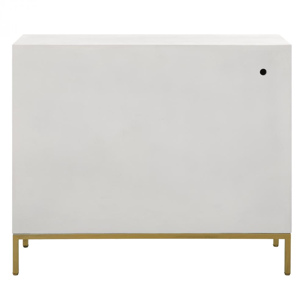 The Front Range Cabinet's Streamlined Design and Classic Finishes Make It A Perfect Addition to Virtually Any Space. The Exterior is Oak Veneer with A Painted White Finish, Accented with Aged Gold Iron. Has One Interior Fixed Shelf.
