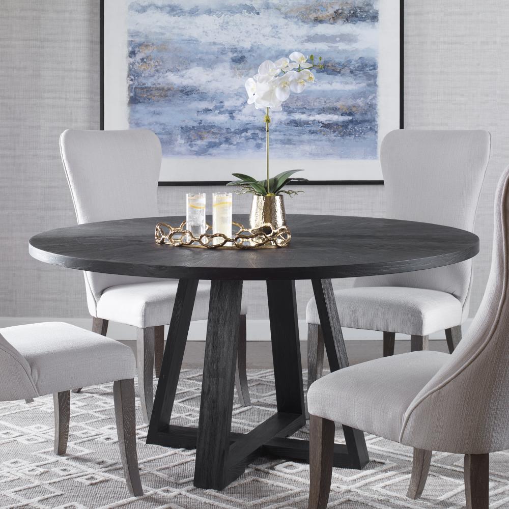 With Clean Casual Styling, This Dining Table Features A Richly Grained Oak Veneer Inlaid Top Finished in A Rich Charcoal Black, Atop A Sturdy Elm Wood Trestle Base. Solid Wood Will Continue to Move with Temperature and Humidity Changes, Which Can Result in Cracks and Uneven Surfaces, Adding to Its Authenticity and Character.