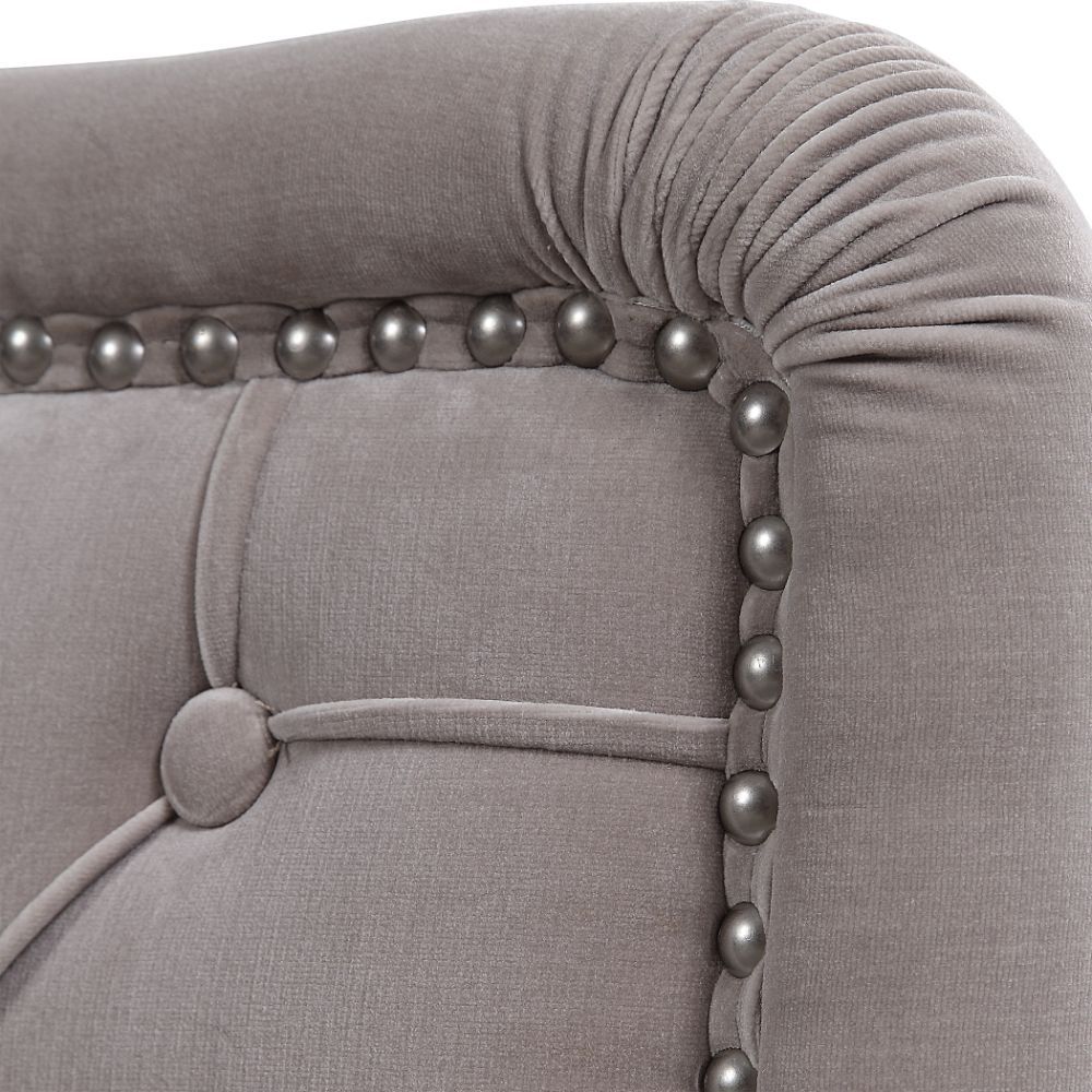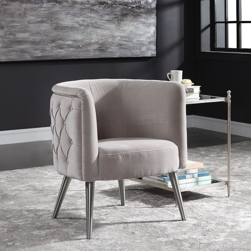 This Stylish Barrel Chair Features A Plush Diamond Button Tufted Outside in A Luxurious Champagne Velvet, Lined with Antique Nickel Nail Head Trim, on Metal Tapered Dowel Legs Finished in Brushed Nickel. Seat Height is 19".