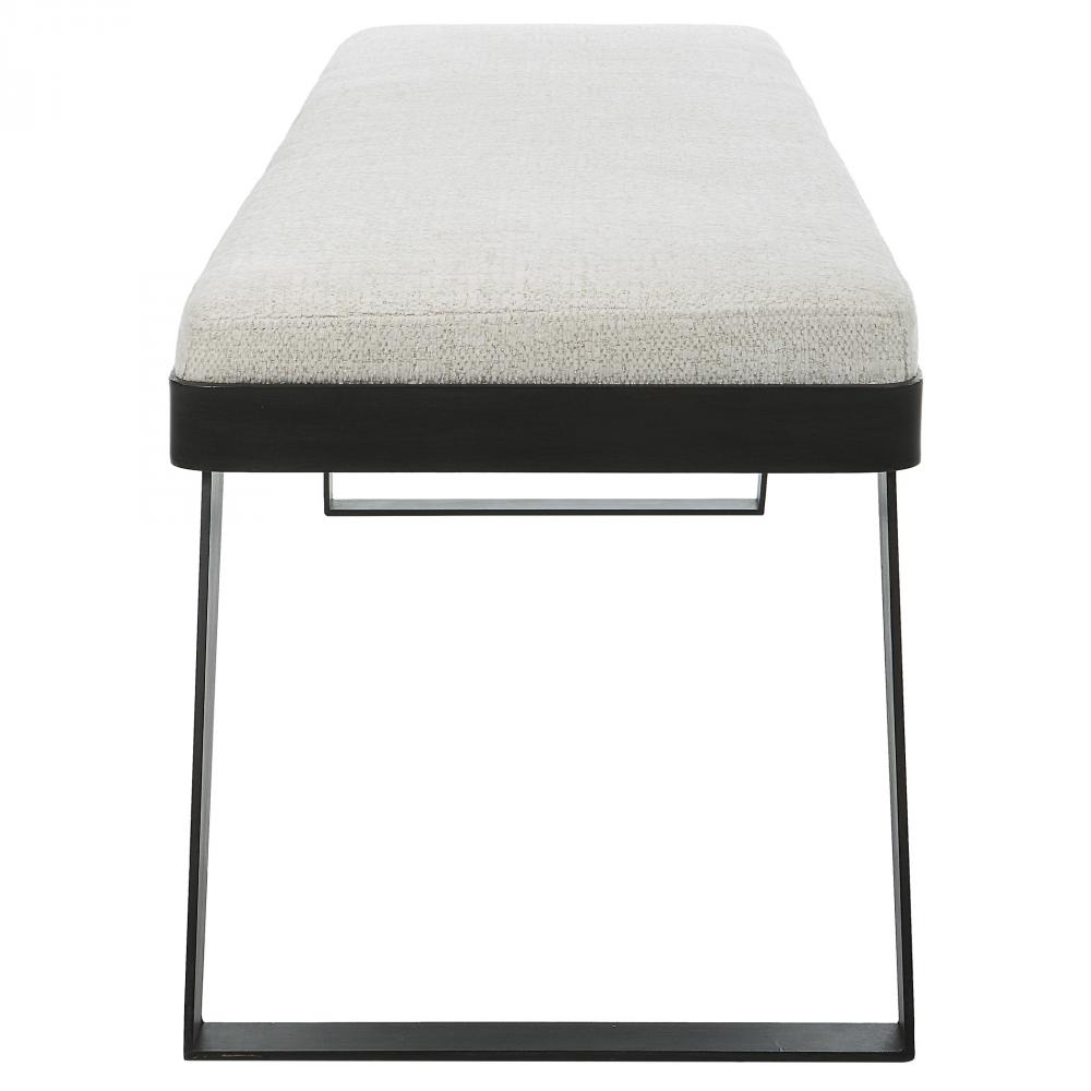 The Modern Hover Bench is Streamlined with An Aged Black Curved Iron Base and Cushioned Seat. Upholstered in A Soft White Boucle Performance Fabric.