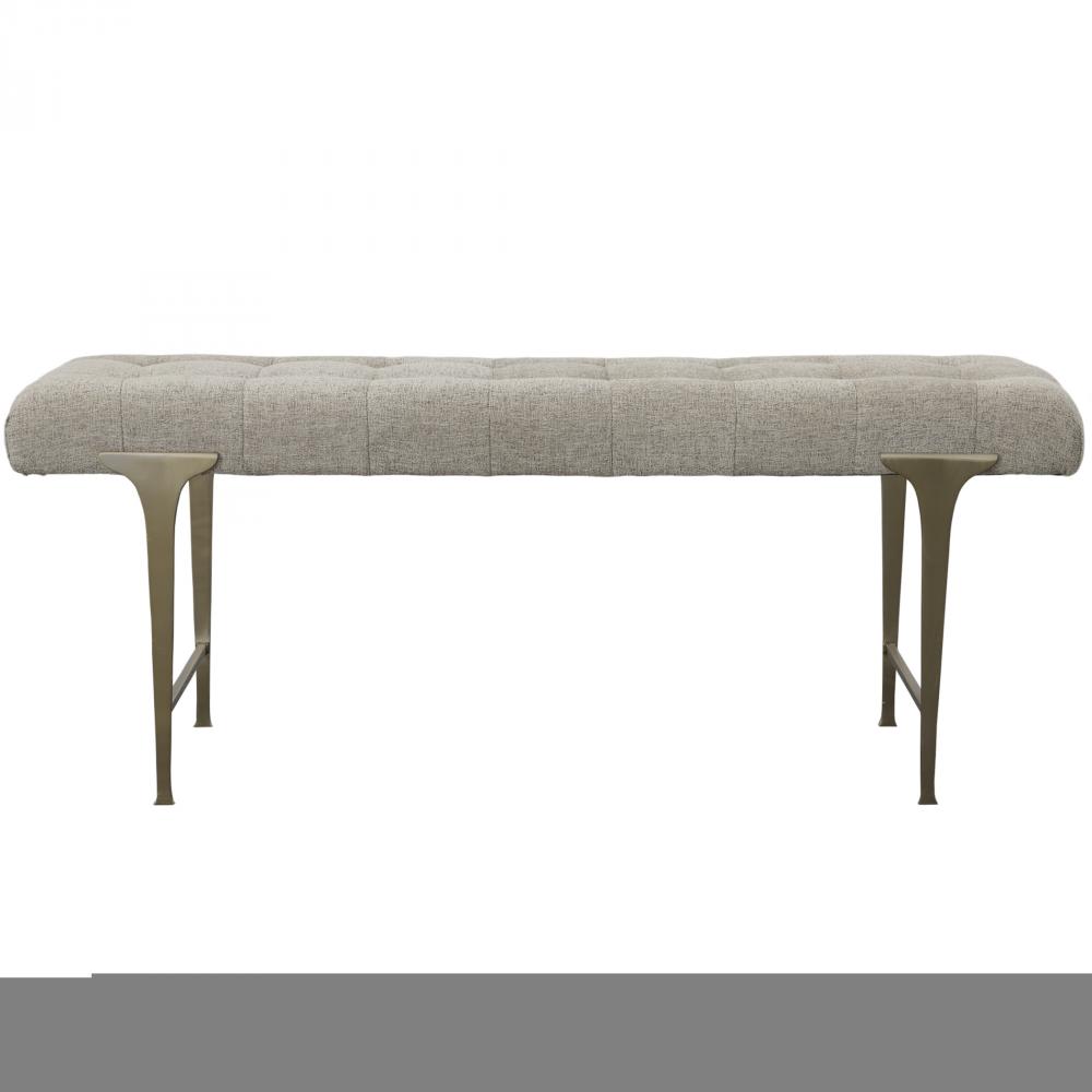 Influenced By Traditional Styling, The Imperial Bench's Cushioned Seat is Upholstered in A Light Taupe Woven Polyester with Biscuit Tufting. The Iron Frame is Finished in Satin Champagne.