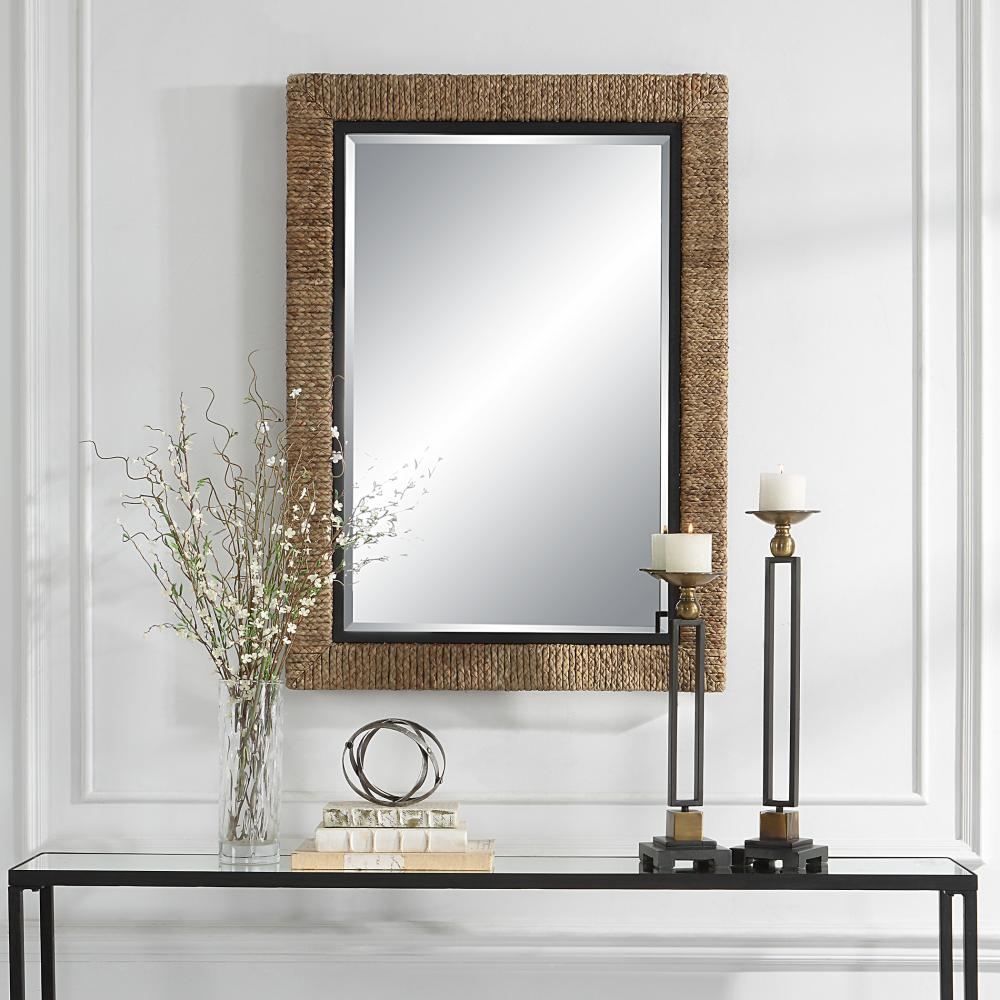 The Island Mirror is Wrapped in Natural Braided Straw with Matte Black Iron Details and A Generous 1 1/4" Bevel. May Be Hung Horizontal or Vertical.