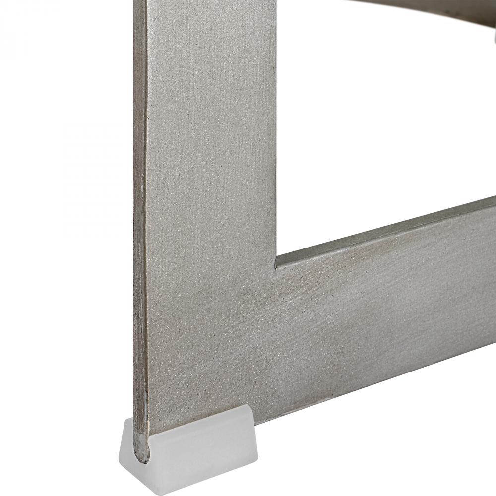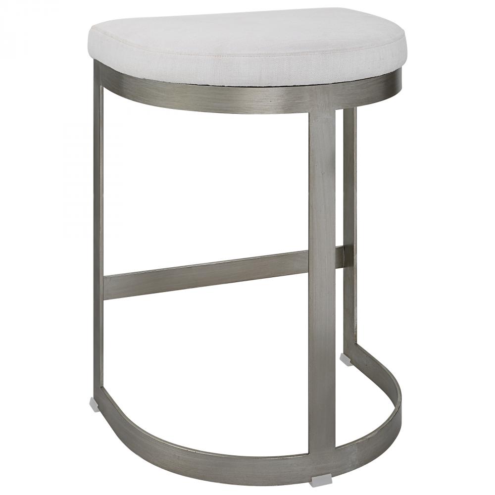 Simplistic But Sturdy, This Statement Counter Stool Features A Thick Hand Forged Iron Base Finished in Brushed Silver. Plush Seat is Tailored in A White Linen Blend Performance Fabric. Seat Height is 26".
