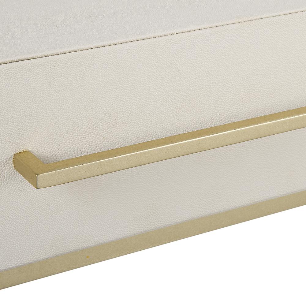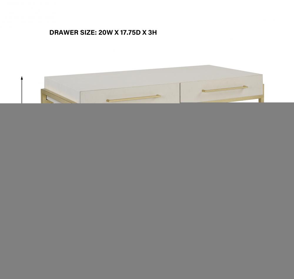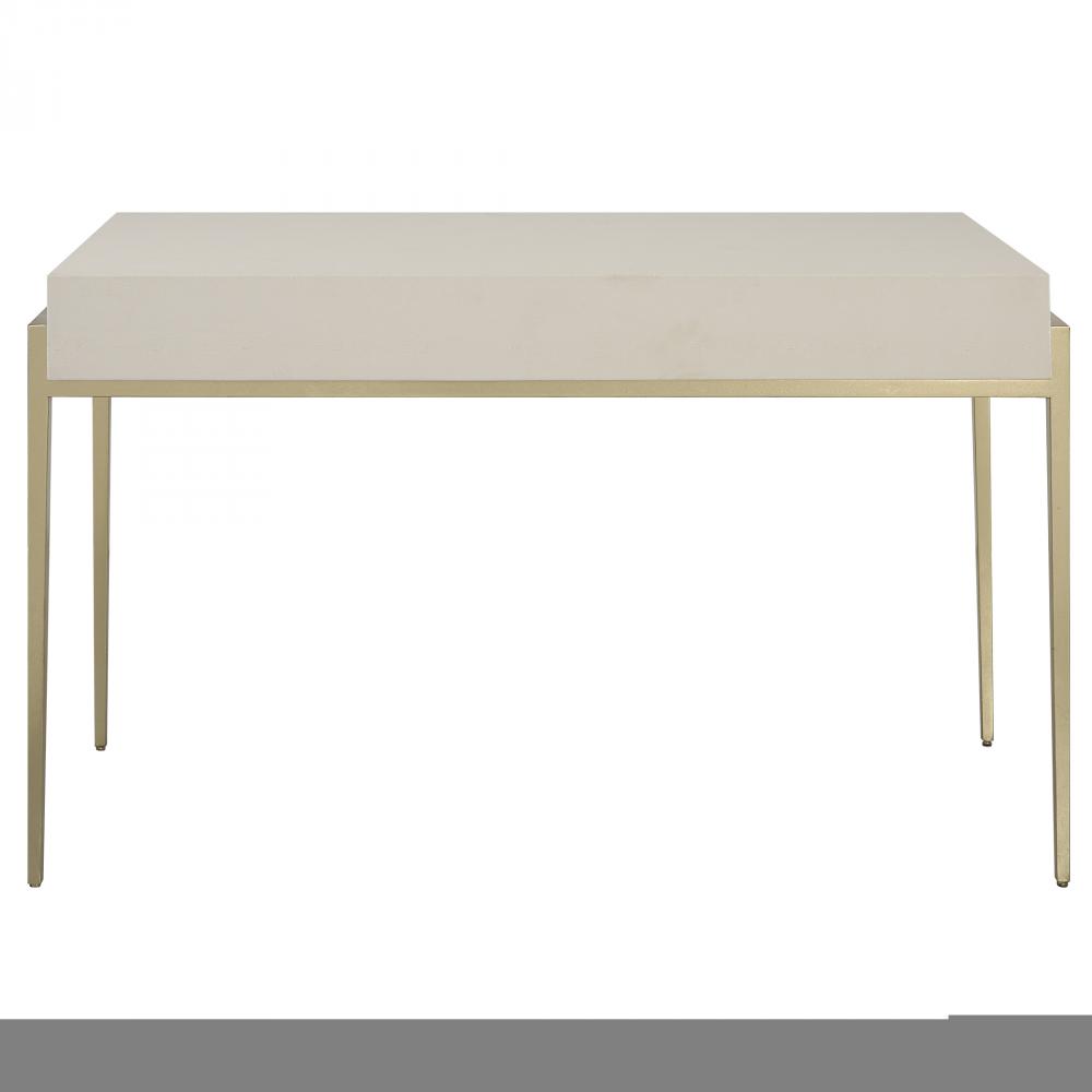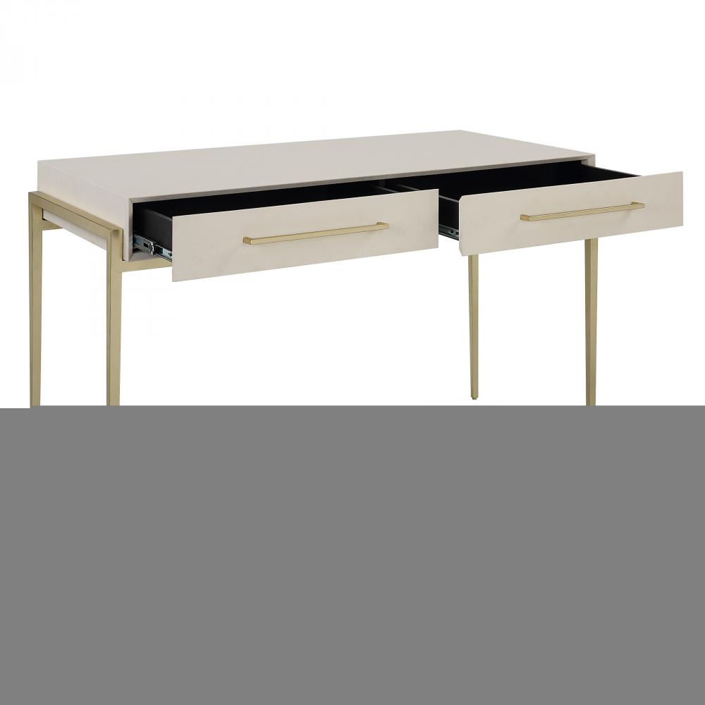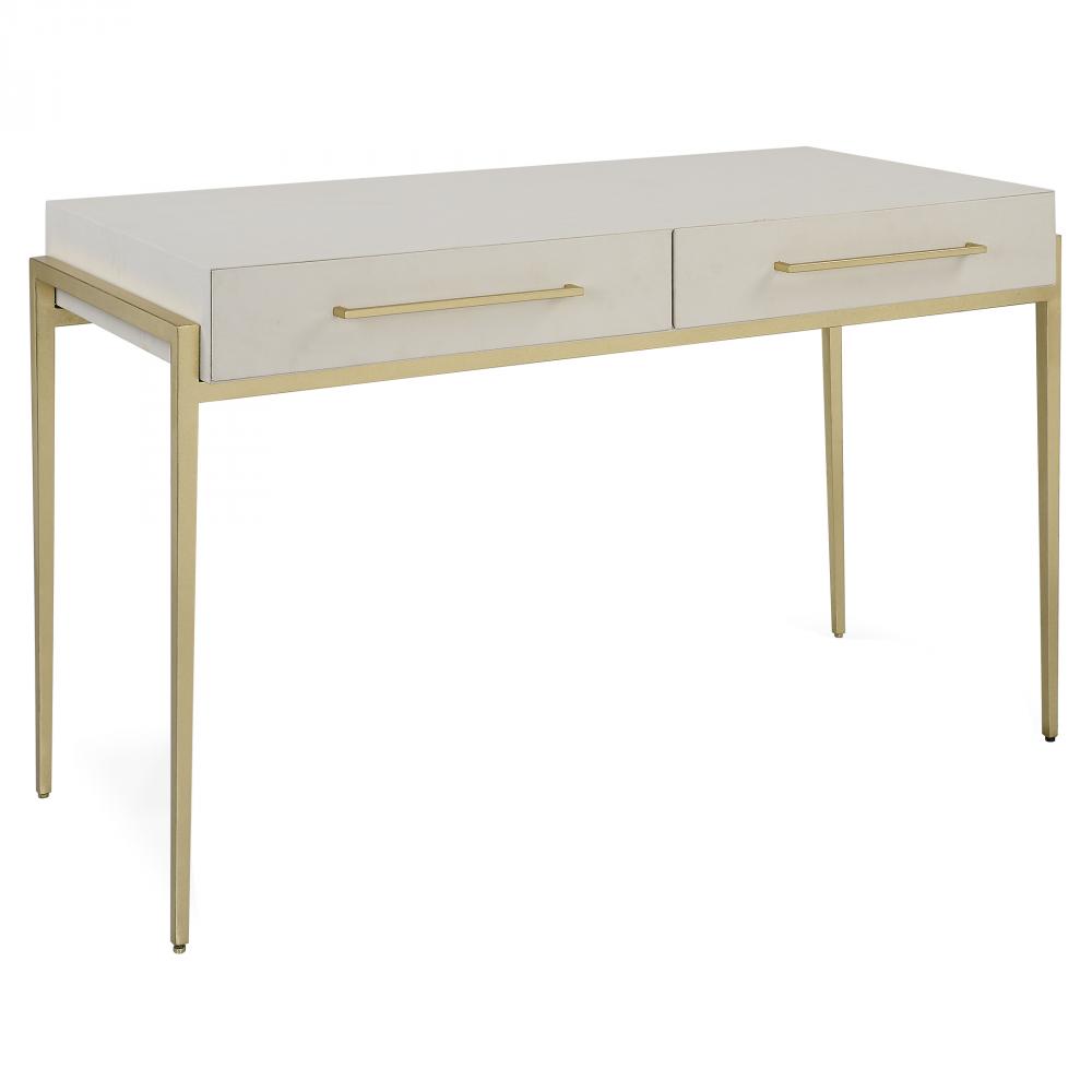 A Modern and Stylish Place to Catch Up on Emails, The Jewel Desk Features A White Faux Shagreen Wrapped Top Nestled Into An Iron Frame in Gold Leaf. The Mitered Edge Drawer Fronts and Gold Drawer Pulls Add to The Sleek Look.