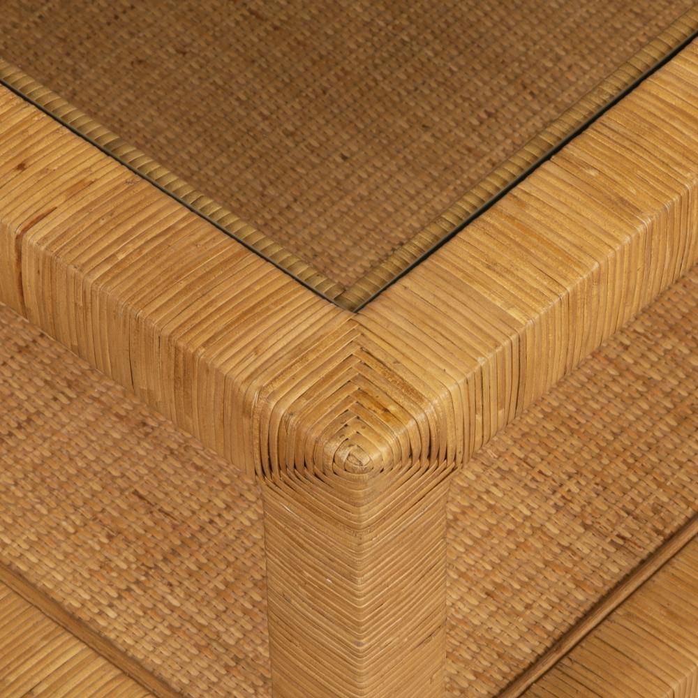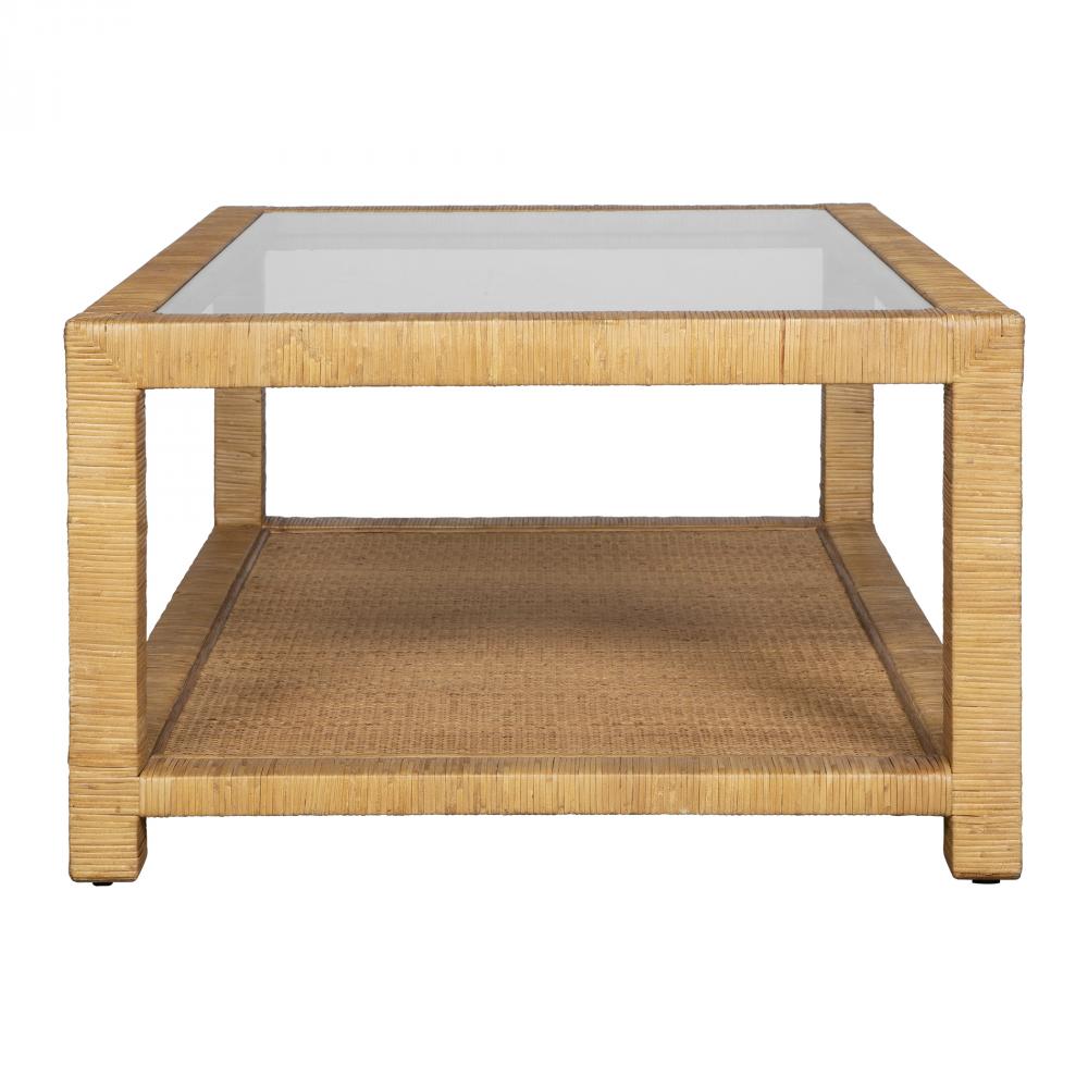 This Casual Coffee Table Offers Generous Display Space And Exudes A Rustic Charm With Its Natural Rattan Wrap Finish, Complemented By A Sleek Glass Top.