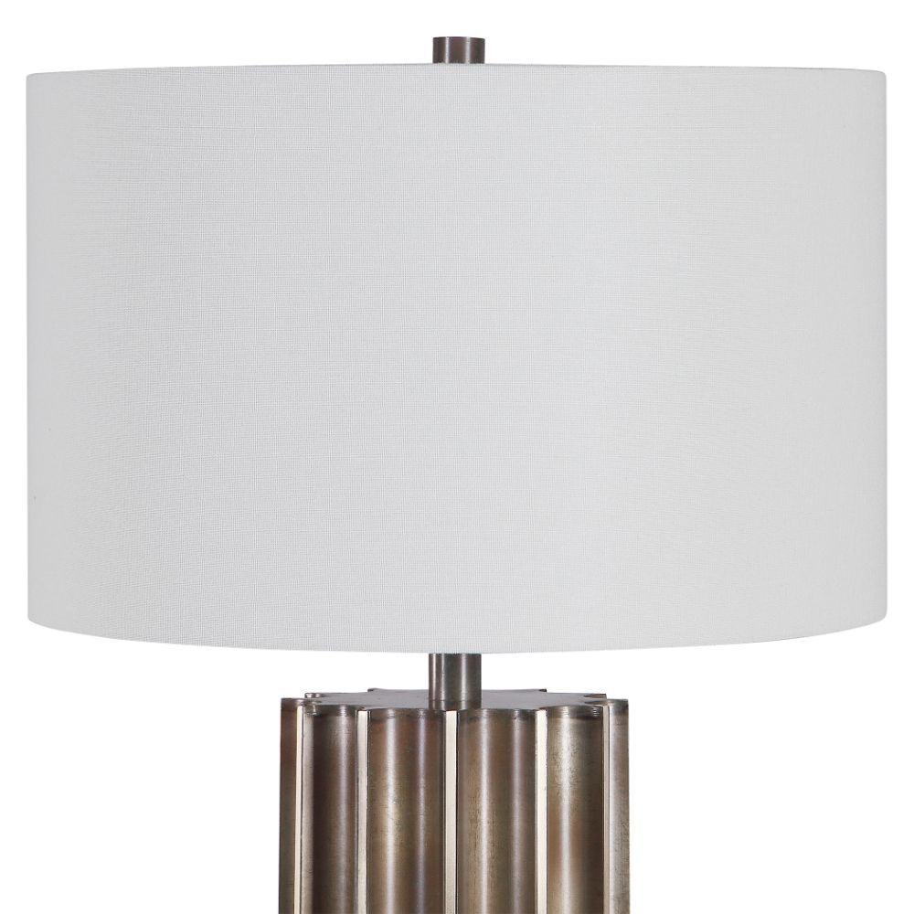 This Table Lamp Features A Deep Fluted Steel Base Finished in An Aged Gunmetal with Rust Distressing and Brass Plated Edges, for A Rustic Industrial Feel. The Round Hardback Drum Shade is A White Linen Fabric.