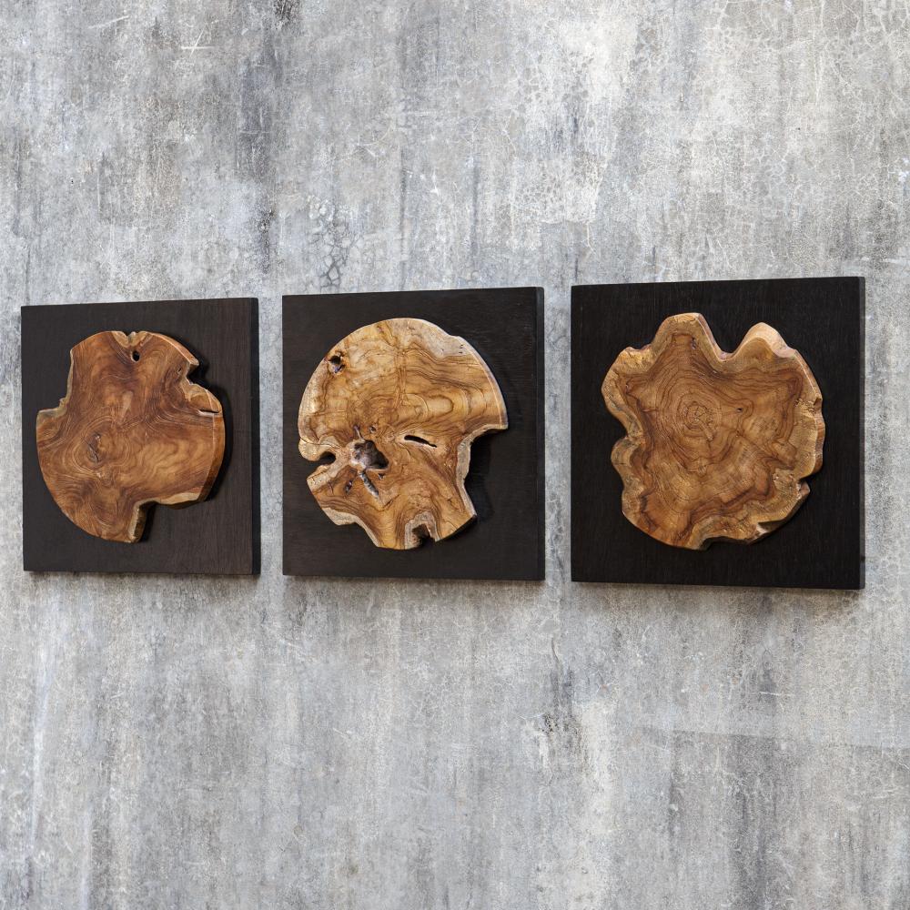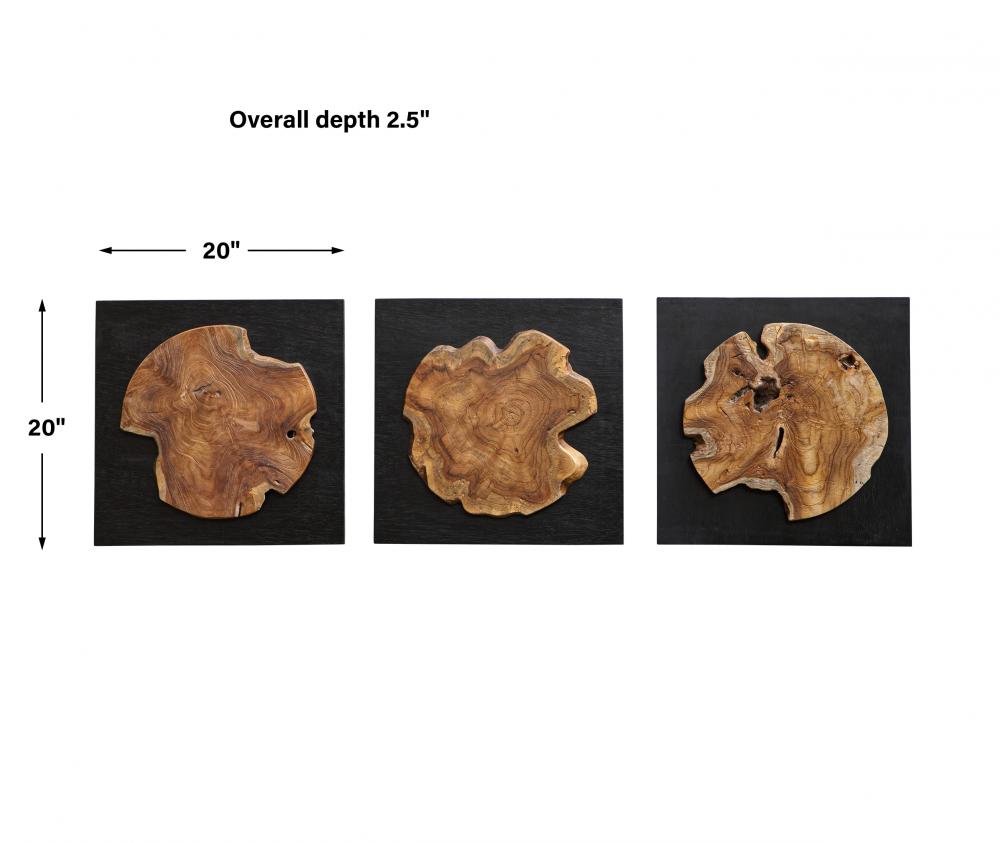 This Striking Set Includes Three Satin Black Wood Panels Featuring Deeply Grained Cross Sections of Natural Teak Wood. Sizes and Grain Pattern May Vary Due to The Authentic Nature.