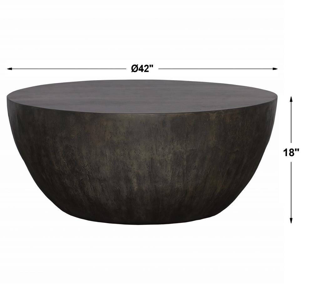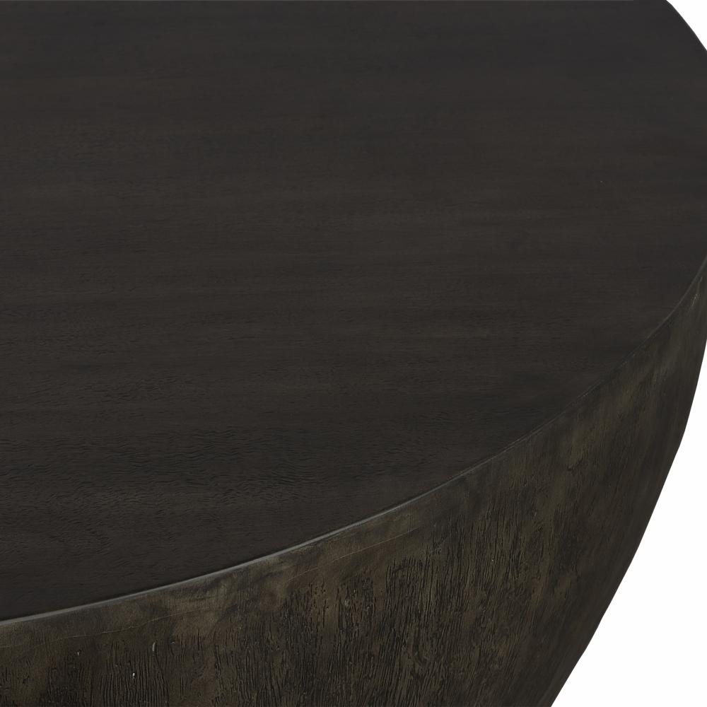 Showcasing A Minimalist Style, This Round Coffee Table Features A Mango Wood Veneer Overlay in A Heavily Textured Aged Walnut Finish.