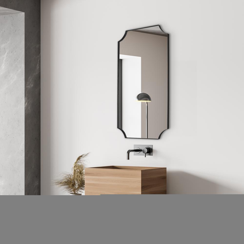 A Stylish Take on Updated Traditional Style, This Mirror Features A Solid Iron Frame Finished in A Sleek Satin Black with Scalloped Corner Detailing. May Be Hung Horizontal or Vertical.