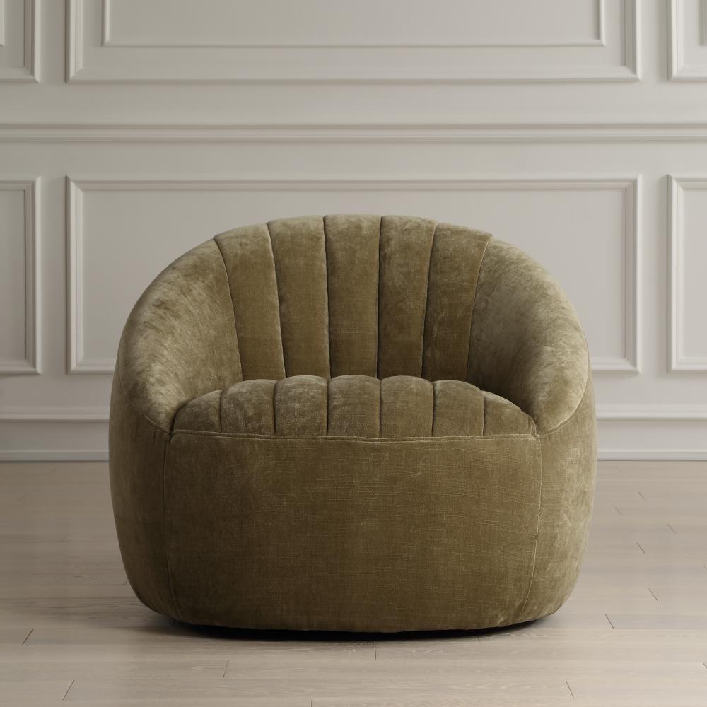 Lush Channel Stitching Creates Understated Style, Fully Upholstered In A Low-pile Chambray Chenille Resembling Antique Velvet In Moss Green. Rests On A Hidden Swivel Base. Seat Height Is 17".
