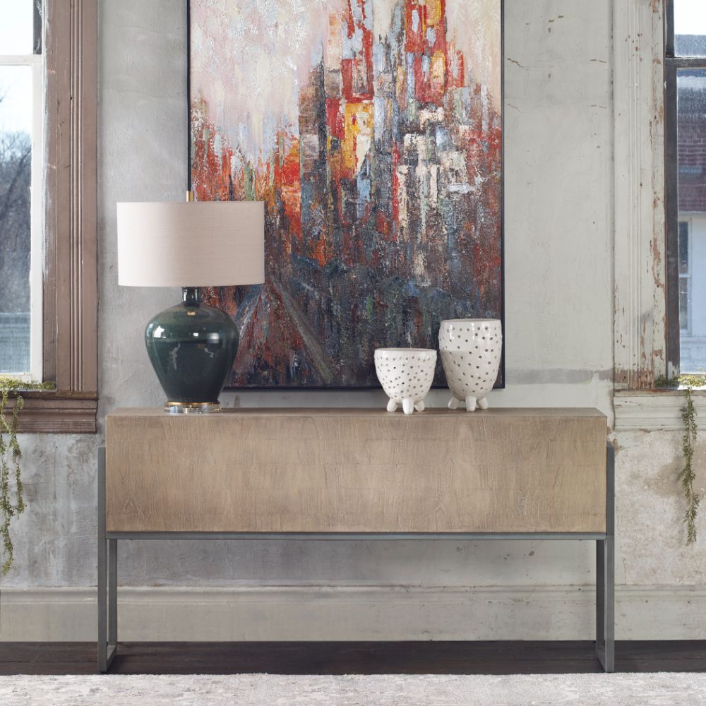A Clean Contemporary Accent, Featuring Mahogany Solids with Mindi Veneer, Finished in A Hand Applied Light Oatmeal Wash. Veneer is Applied in A Layered Fashion, Creating The Varying Grain Patterns on The Body, Set Into An Aged Iron Frame.