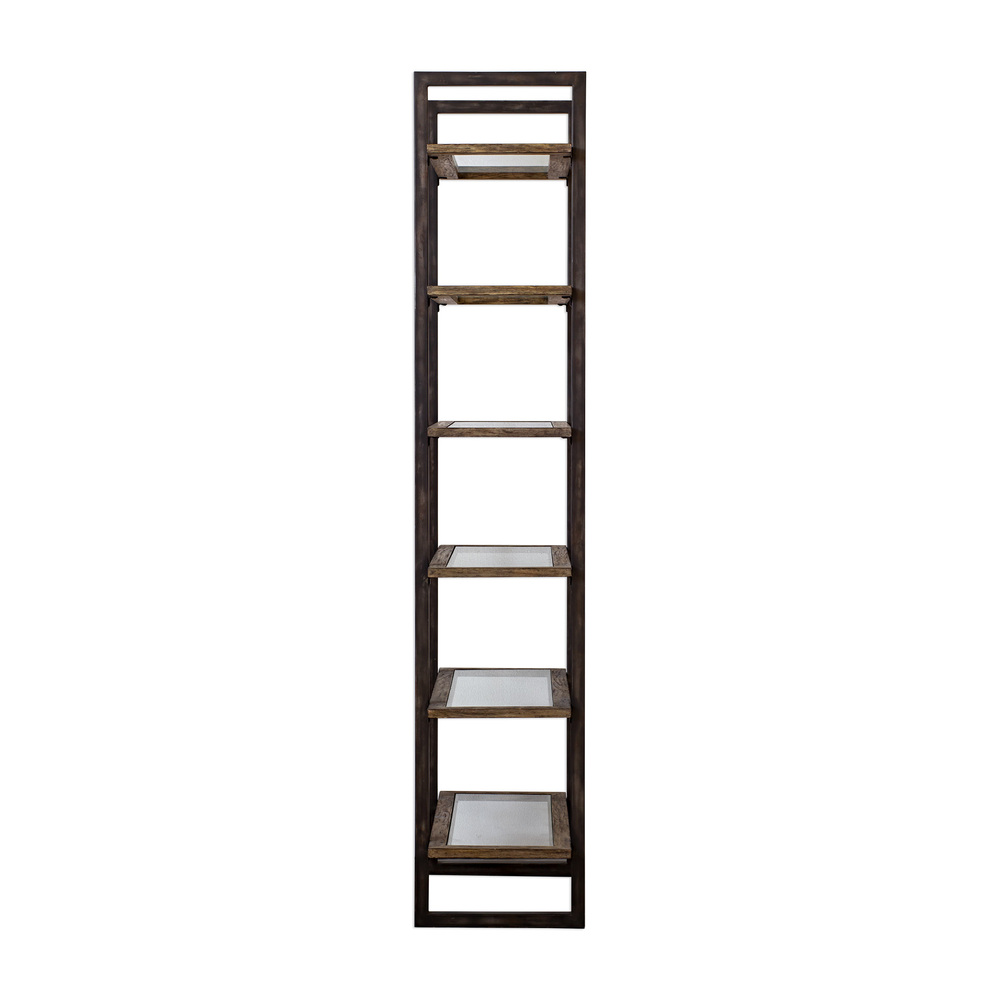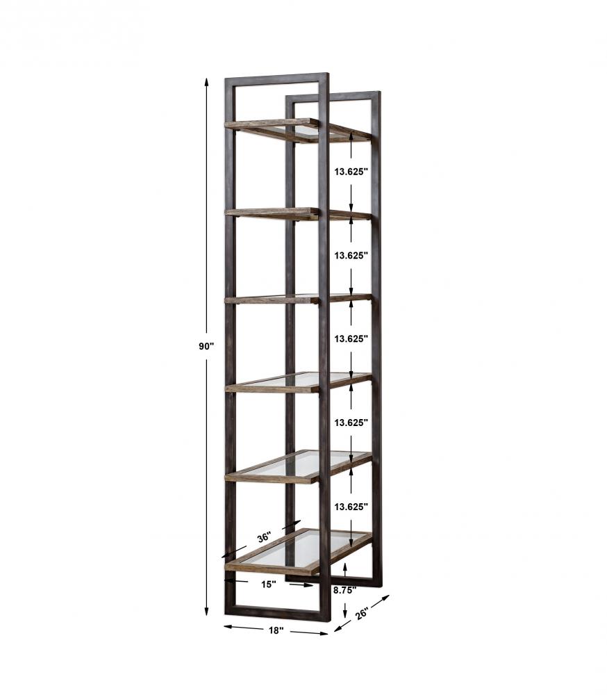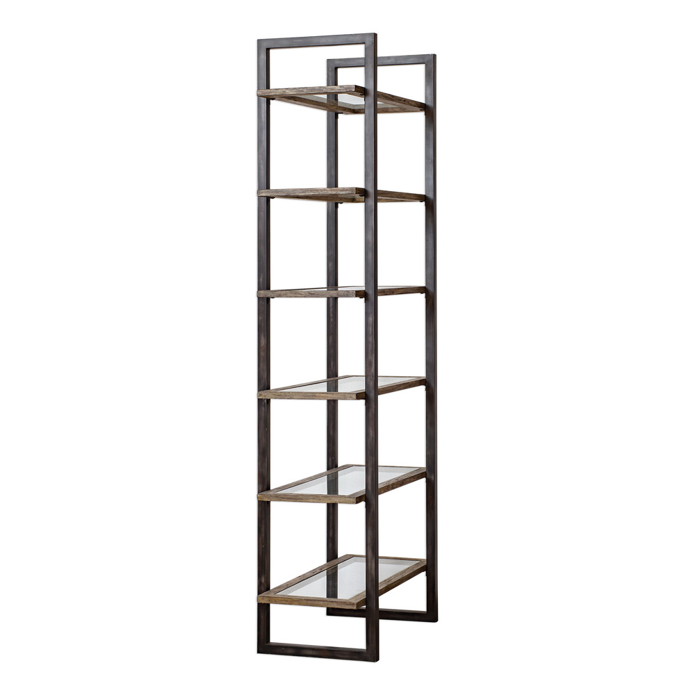 This Forged Iron Framed Etagere, Finished in Aged Steel with Light Distressing Features Six Display Shelves with Driftwood Finished Surrounds, Inset with Clear Glass.