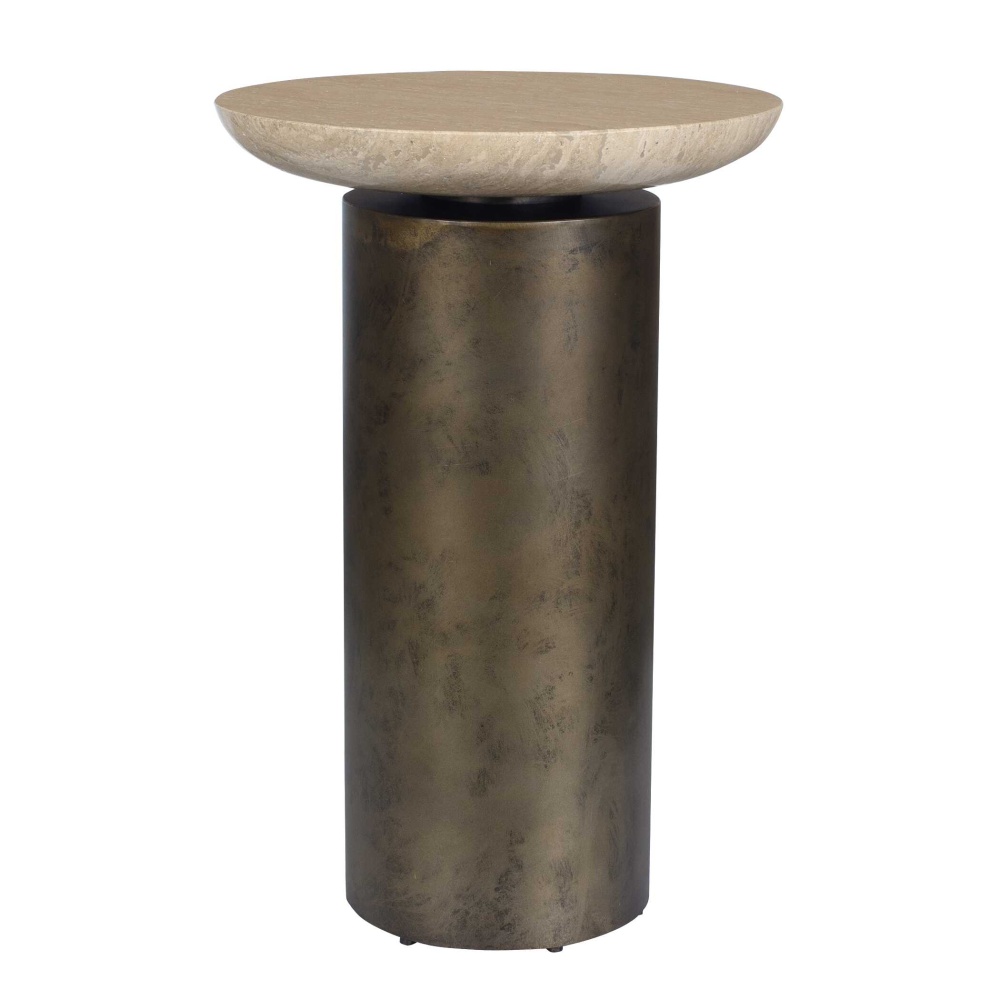 This Contemporary Accent Table Showcases A Captivating Contrast Between Its Sleek, Antique Brass Iron Base And Its Travertine Top. Because Of The Natural Characteristics Of Stone, Each Piece Will Have Unique Color And Variation. Suitable For Both Indoor And Outdoor Use.