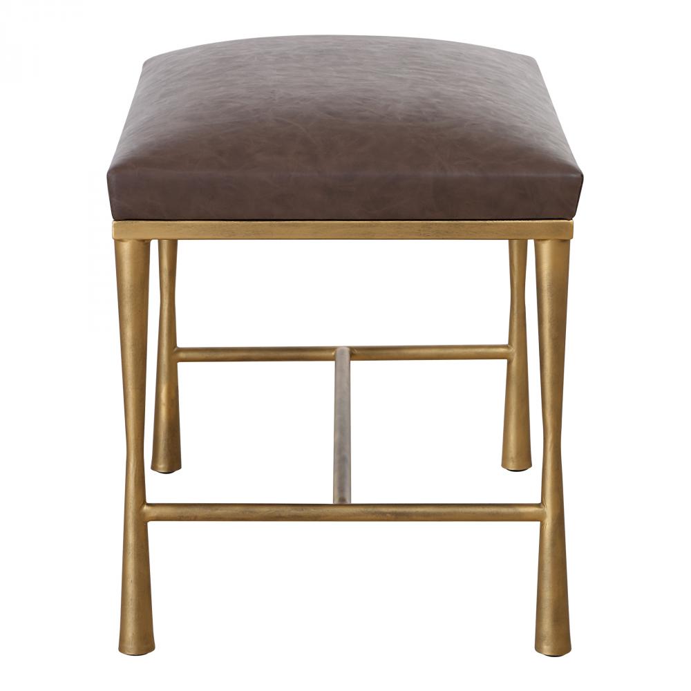 A Classic Transitional Accent Bench In Rich Tones, Featuring Cocoa Distressed Faux Leather And A Sturdy Iron Base In Lightly Antiqued Gold.