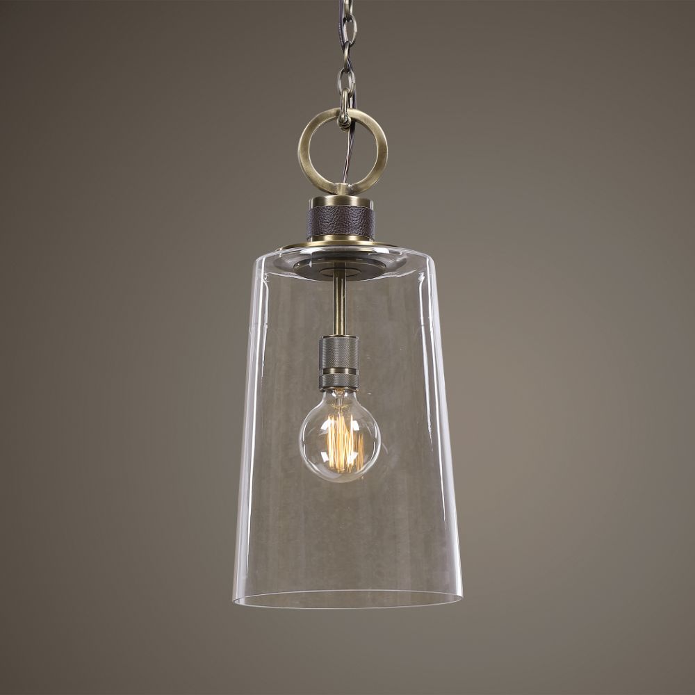 Refined Industrial Looks Give This 1 Lt. Mini Pendant Its Design Roots, with An Antique Brass Finish, It is Dressed Up with A Textured Brown Leather Band At The Top. 1-100 Watt Max Edison Socket. Bulbs Not Included. Supplied with 12' Wire and 5' Chain for Adjustable Installation.
