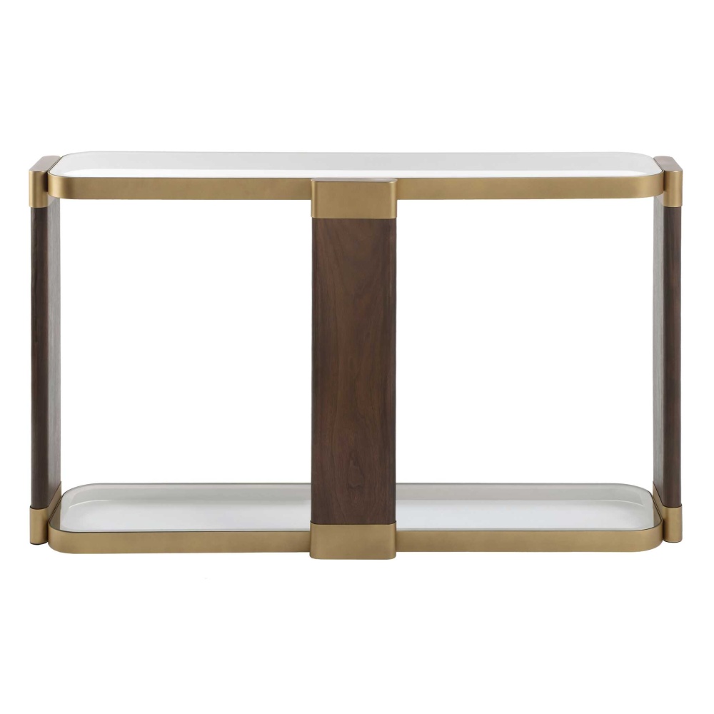 The Ryles Console Table Features Elegant Walnut Veneer Legs With Gold Finished Iron Detailing Around The Edges. The Table Is Complemented By Both A Tempered Glass Top And Bottom Shelf.