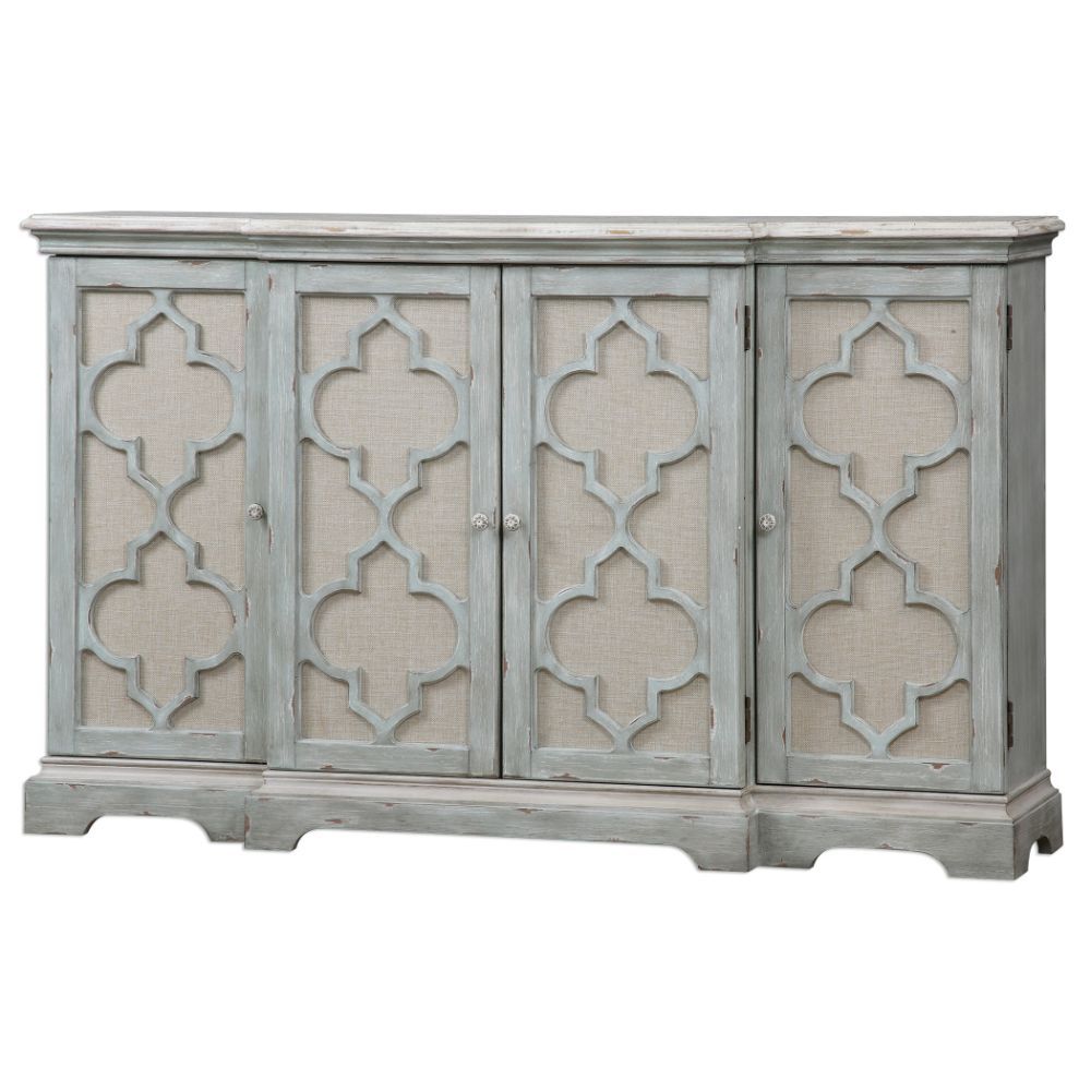 Breakfront Console in Weathered Sea Gray with Ivory Accents. Open-carved Doors Are Backed in Light Tan Linen, Enclosing Three Adjustable Shelves.