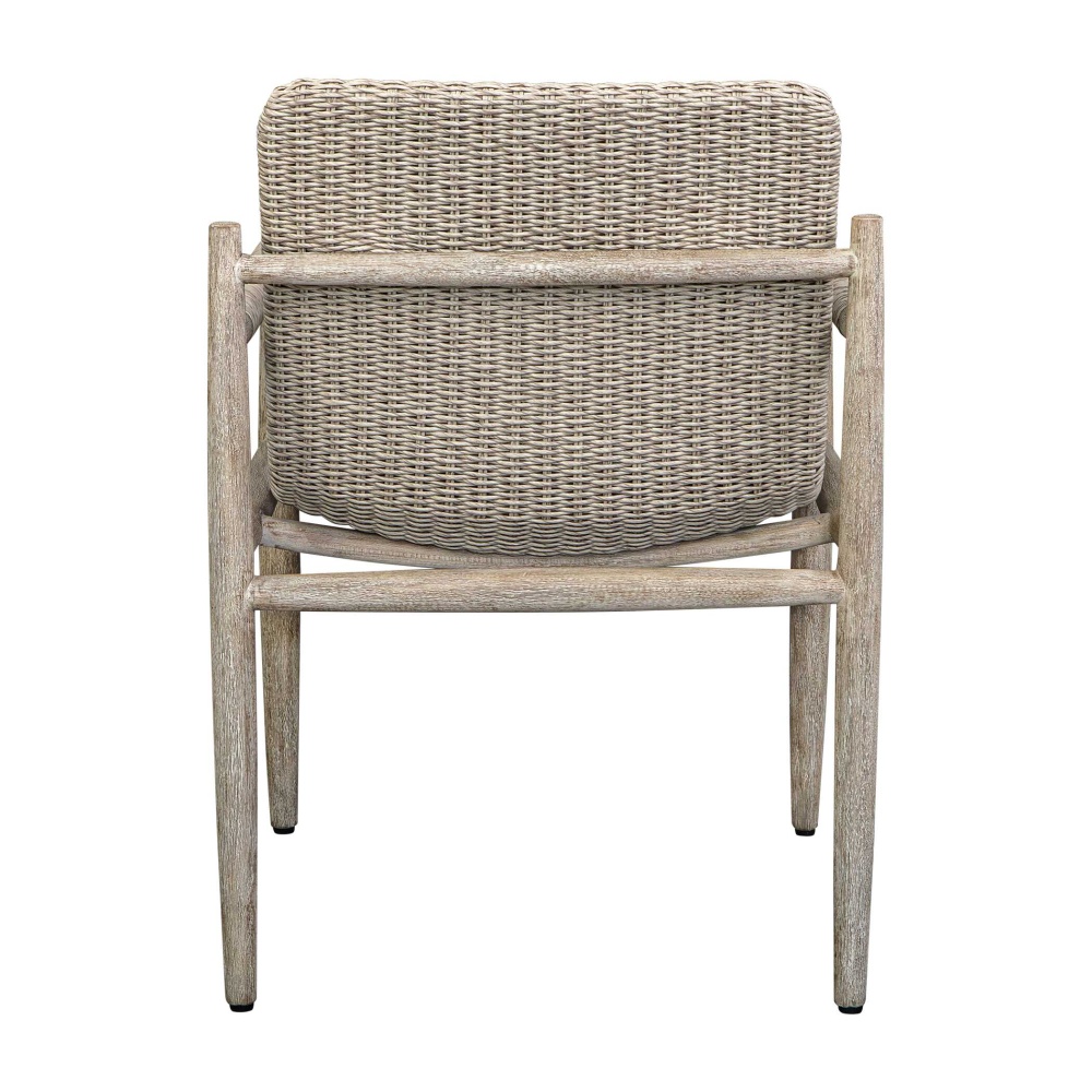 Indulge In Comfort With The Stylish Sumba Outdoor Dining Chair. The Continuous Scooped Seat In Light Gray All-weather Wicker Offers A Relaxing Feel, Cradled By The Durable Mahogany Wood Frame Finished In Cerused Wheat, Ensuring Long-lasting Use.