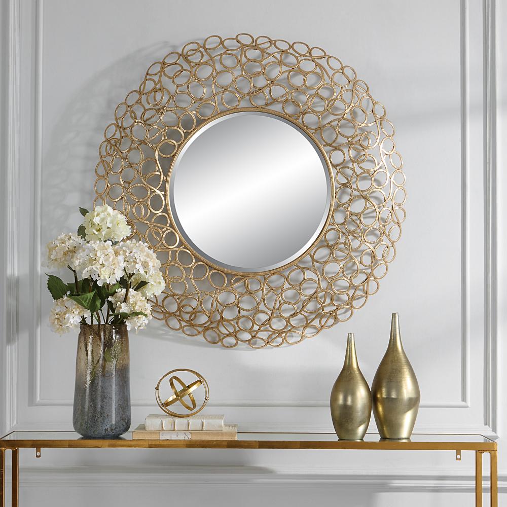 Handcrafted From Solid Iron, This Round Mirror Features A Dramatic 3-dimensional Frame Made From Curled Gold Leaf Details. Mirror Features A Generous 1 1/4" Bevel.