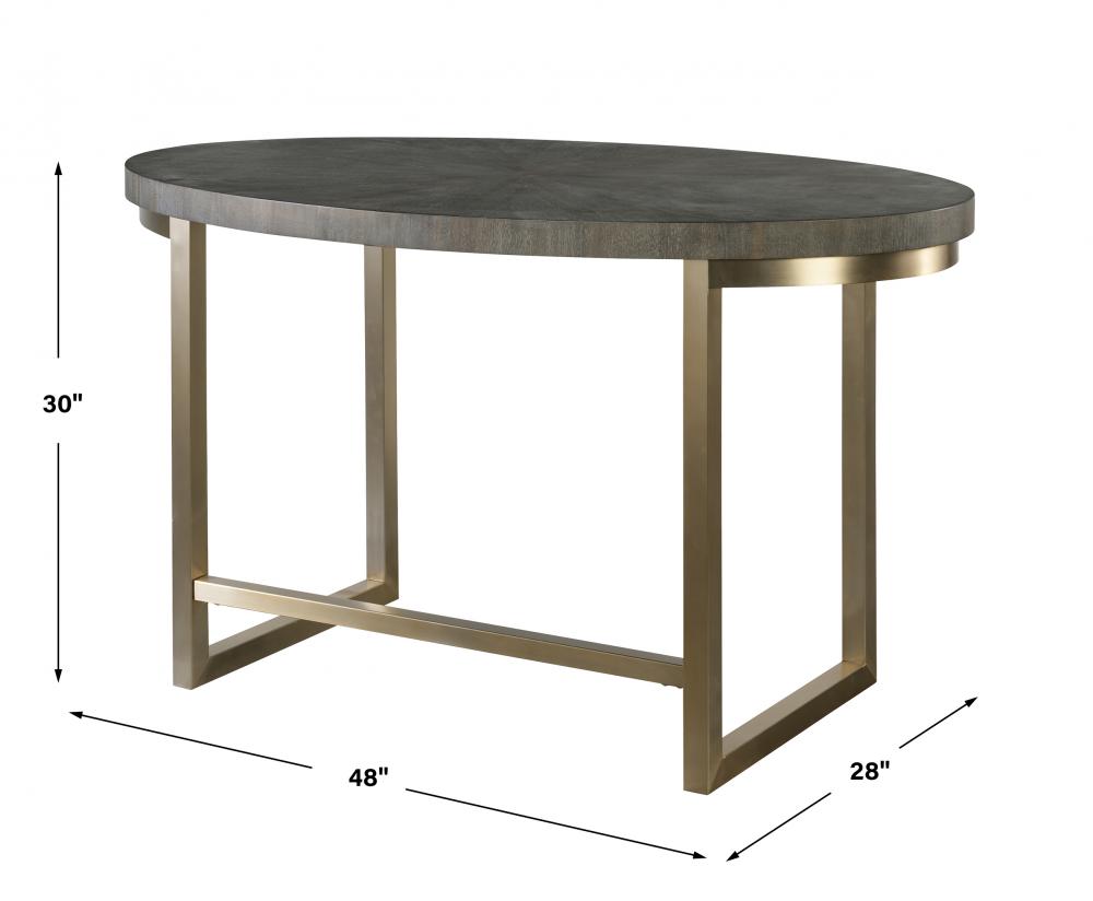 Contemporary in Style, This Oval Writing Desk Features A Bold Stainless Steel Base Plated in Brushed Brass with An Acacia Veneer Top in A Dark Walnut Stain Washed with A Light Gray Glaze.