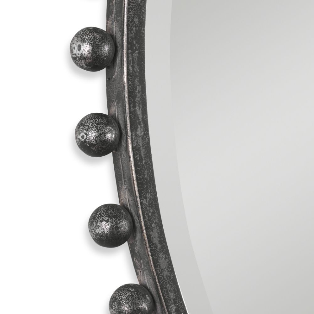 Petite Iron Spheres Line The Outer Edge of This Round Frame, Finished in A Distressed Black with Silver Highlights and A Light Gray Glaze. Mirror Features A Generous 1 1/4" Bevel.