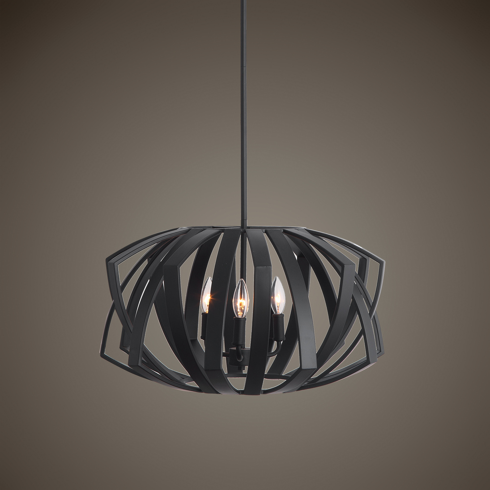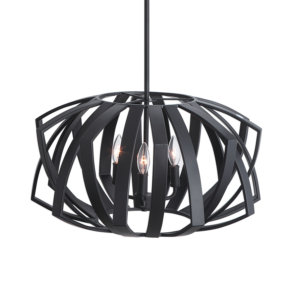 Matte Black Geometric Pendant Harkens From Mid-century Design Roots. 3-60 Watt Max, Candelabra Sockets. Bulbs Not Included. Supplied with 15' Wire, 3-12" Stems and 1-6" Stem for Adjustable Installation.