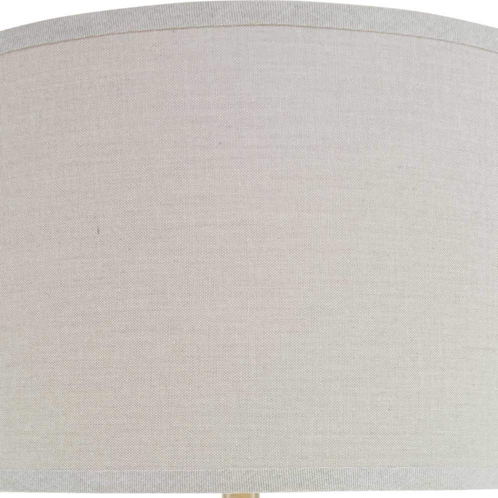 Grooved, Transparent Charcoal Gray Glass Accented with Antiqued Brass Plated Details. The Round Hardback Drum Shade is A Light Beige with Natural Slubbing.