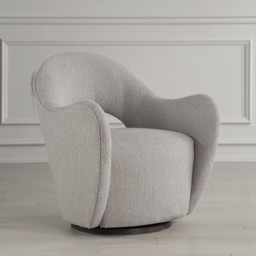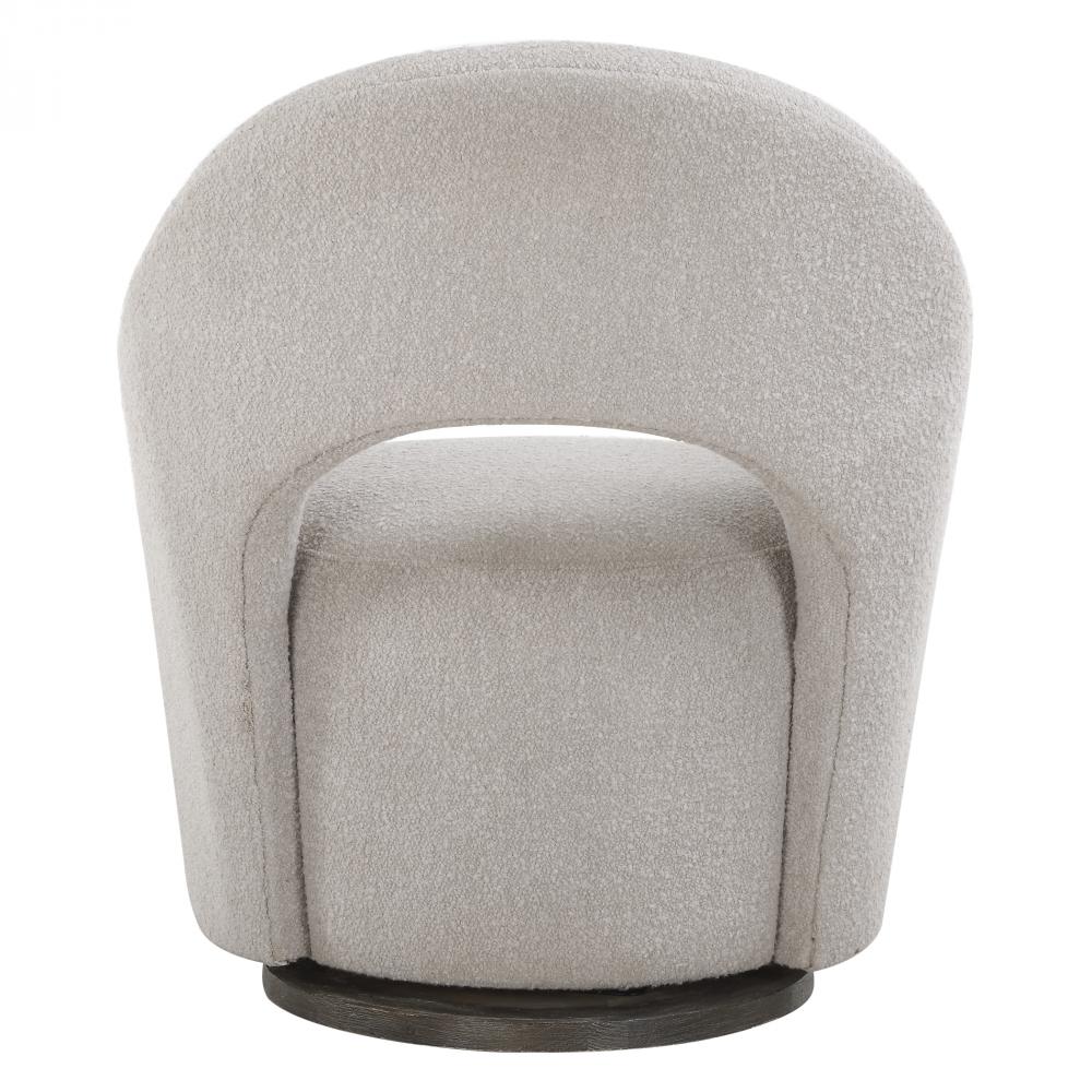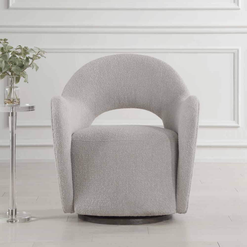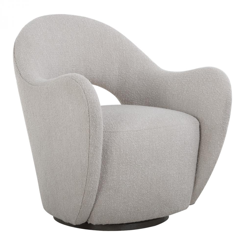 Gentle Curves And Fun Cutouts Give A Unexpected Twist In The Wander Swivel Chair. Upholstered In An Oat Toned Polyester Blend With Wool-like Texture, Resting Atop A Dark Walnut Finished Base That Peeks Out In The Back. Has A Toxin-free, Eco Friendly Treatment To Help Resist Water Based Stains. Seat Height Is 19".