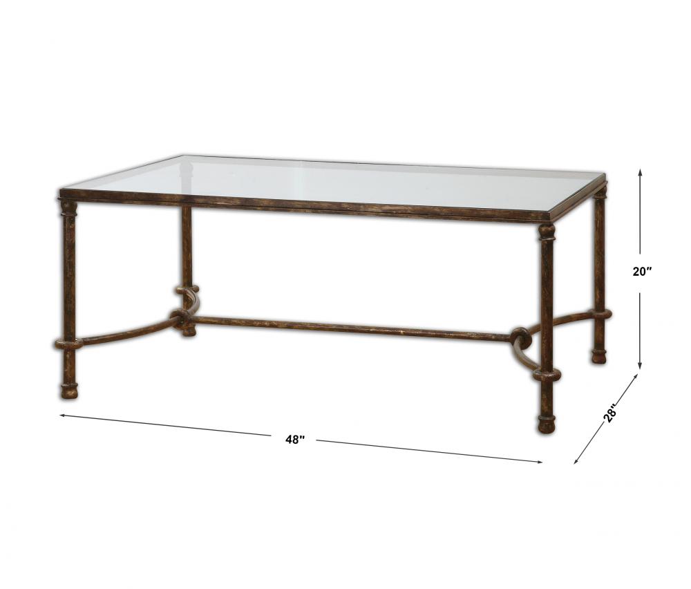 Inspired By Ancient Horse Bridles, This Forged Iron Coffee Table is A Blending of Rings and Curves Finished in Rustic Bronze Patina. The Top is Made of Clear, Tempered Glass.