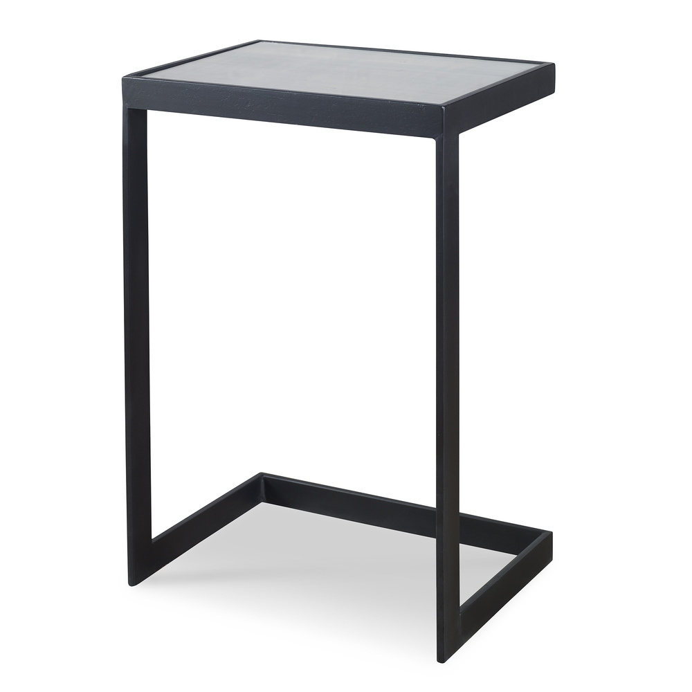 A Simplistic Cantilever Design with Classic Style, Features Thick Aged Black Iron with An Open Framed Base, and A Mirrored Top with Linear Antiquing and Distressed Edges.