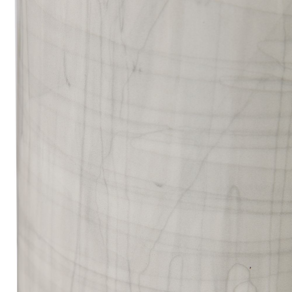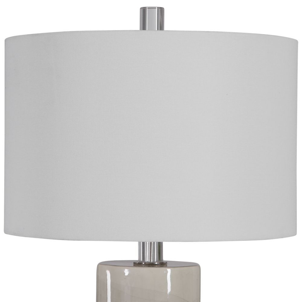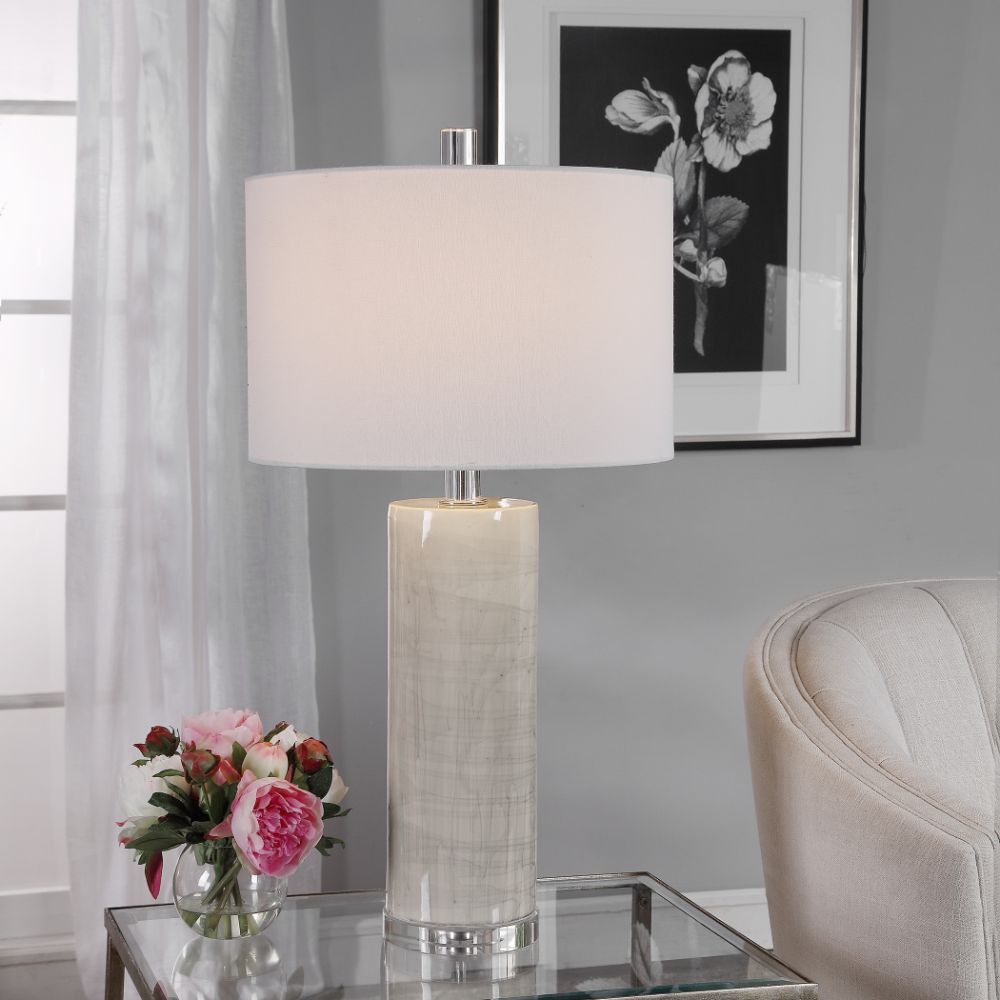 Modern in Design, This Ceramic Table Lamp Showcases A Neutral Beige Glaze with An Abstract Gray Drip Pattern, Paired with Elegant Crystal Details and Polished Nickel Plated Accents. The Hardback Drum Shade is A White Linen Fabric.