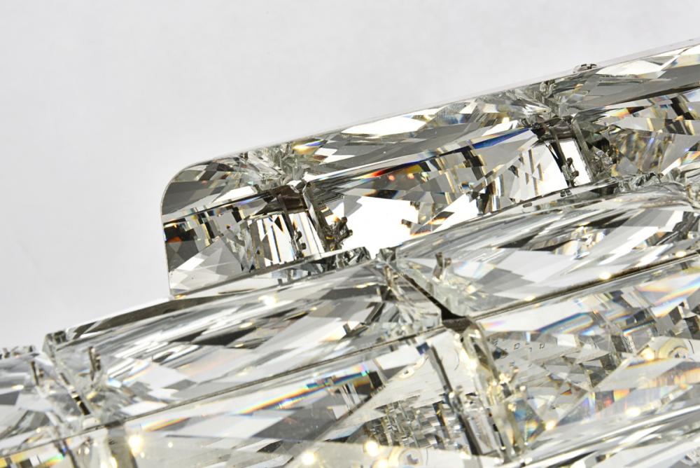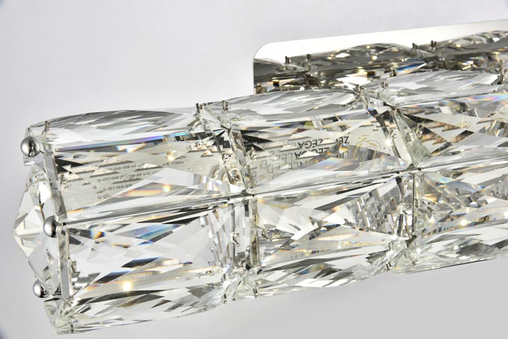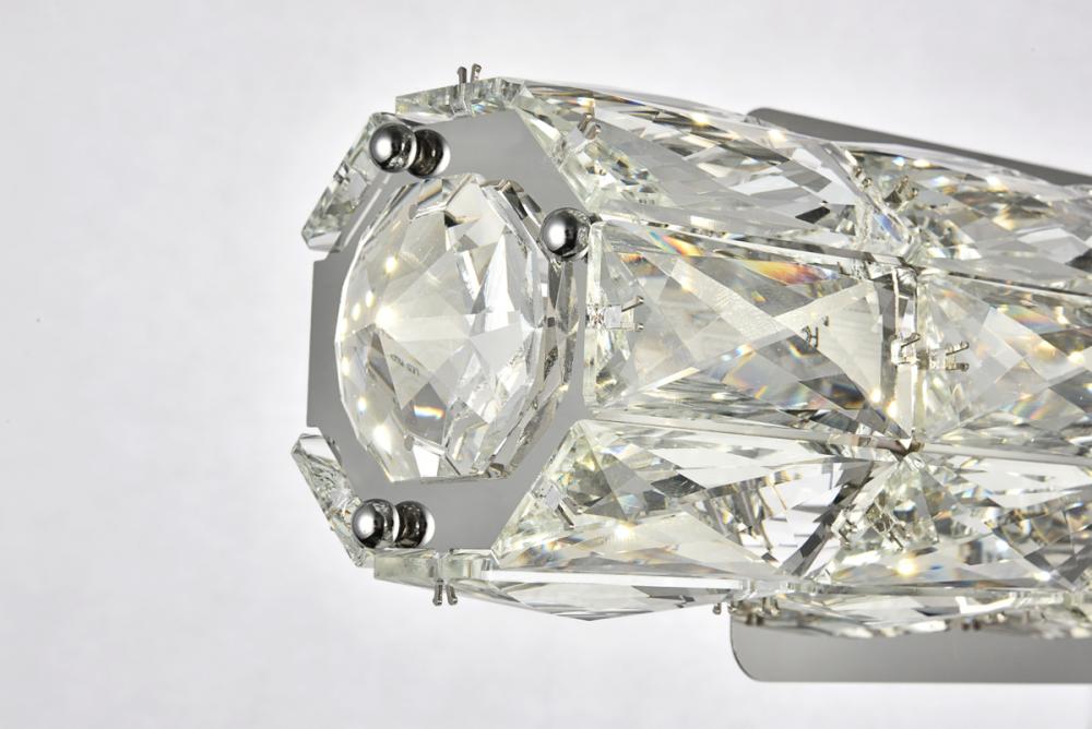 Valetta wall sconces dress up a bathroom, office, or bedroom without overwhelming the surrounding décor. This collection features an octagonal tube-shaped stainless-steel frame covered almost entirely with shining rectangular royal-cut clear crystals. Faceted crystal octagonal crystals cover both ends as a charming finishing touch. The chrome-finished backplate is polished to a mirror shine and reflects the glittering crystals for additional sparkle. A sleek chrome finish completes this modern look. Available in four size options.